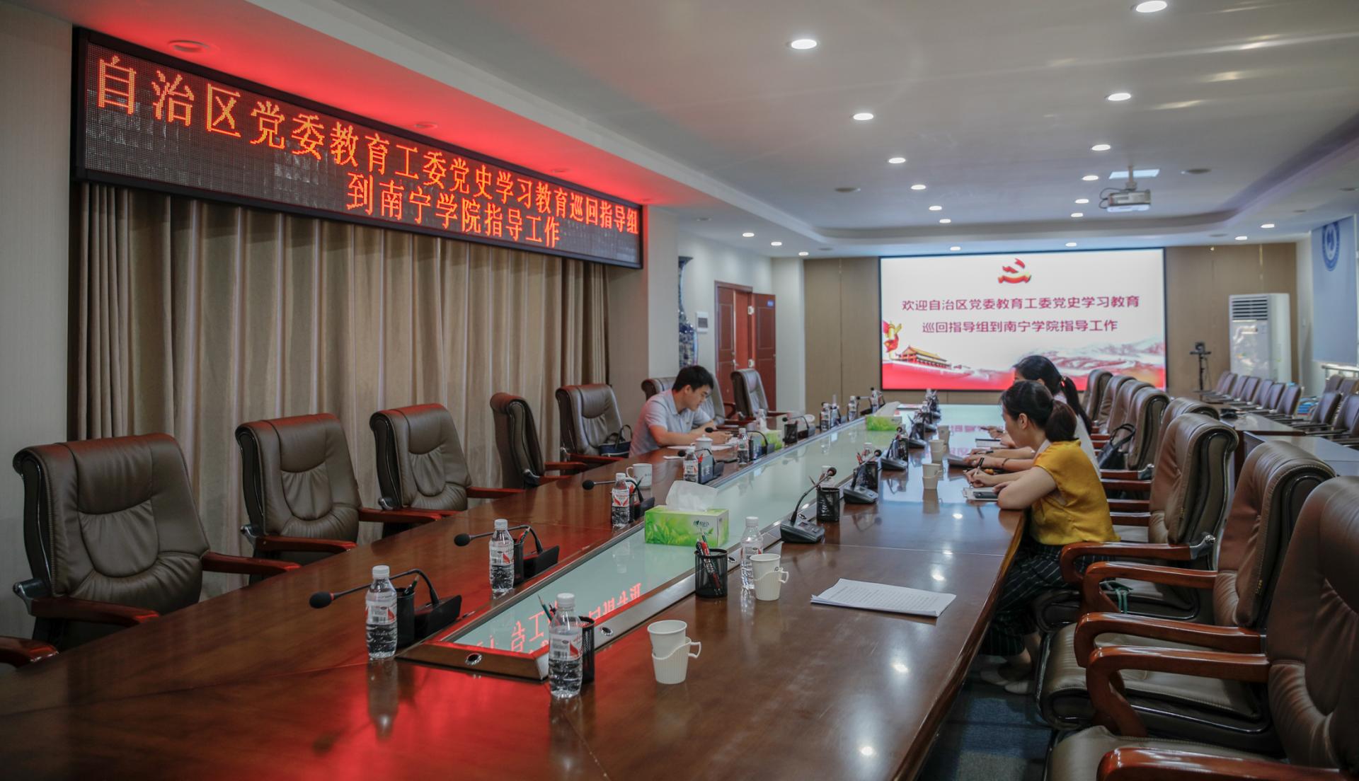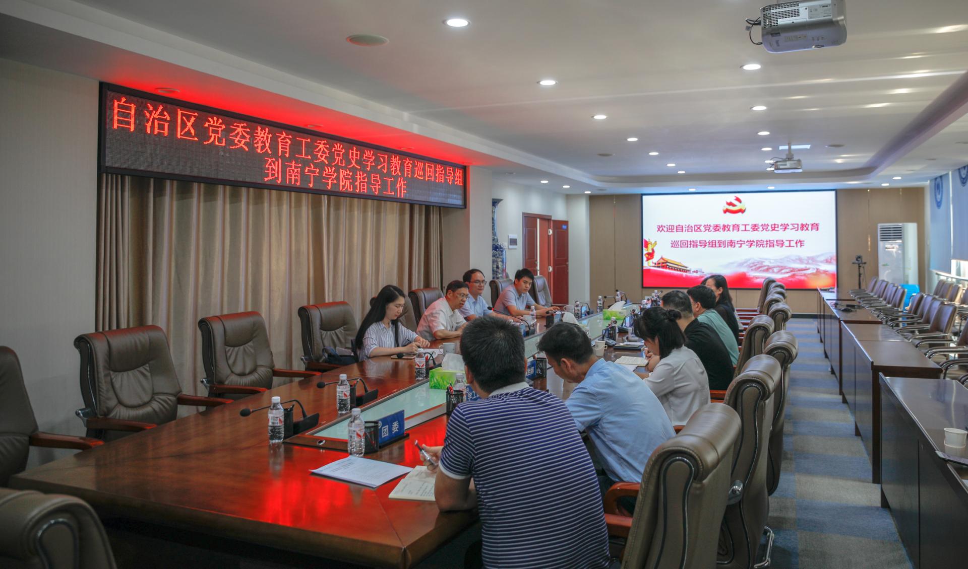 2021年5月28日下午,自治区党委教育工委党史学习教育巡回指导组到南宁学院对学校党史学习教育工作开展第一轮巡回指导。指导组由广西民族大学原党委副书记宁耀担任组长,广西民族大学党委宣传部副部长张宏宇、广西中医药大学马克思主义学院教师黄英、广西机电职业技术学院马克思主义学院教师农冠军为组员。学校党委书记刘彪、党委职能部门有关负责同志陪同。
