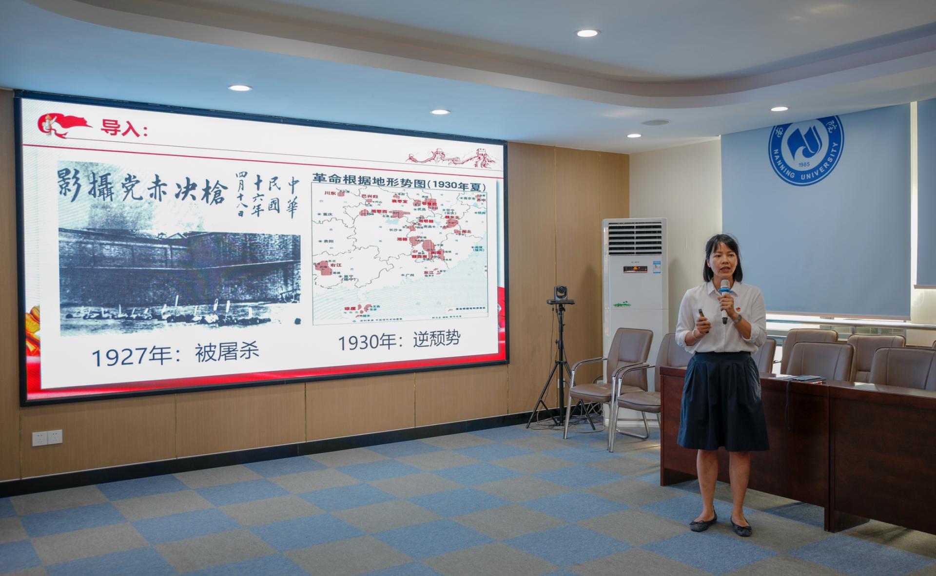 马克思主义学院教师黄丝娜向指导组作微党课展示