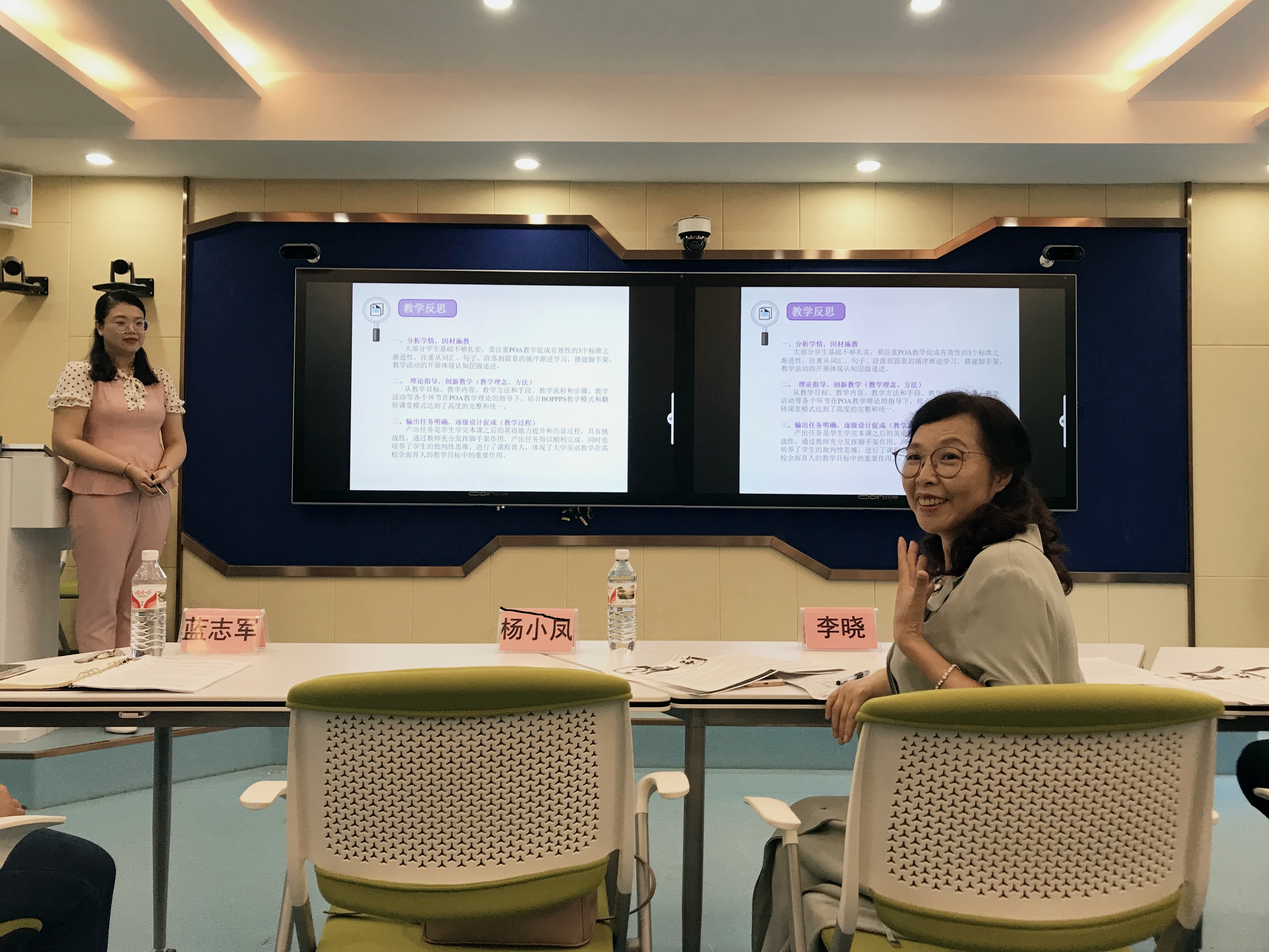 活动中,陶婕老师首先按大赛规则进行了20分钟的课堂教学展示和5分钟的教学反思。随后,李晓教授进行点评,从教学设计、教学内容、PPT设计、讲课技巧、板书等方面进行了有针对性地指导,提出了诸多宝贵建议。接着,张天乾教授和蓝志军副院长也分别进行了点评。通过本次活动,参赛教师对比赛形势、授课技巧以及课件制作有了更清晰的认识,更好地掌握了比赛方法。专家的点评也令现场教师受益匪浅,大家积极讨论,教研热情高涨。