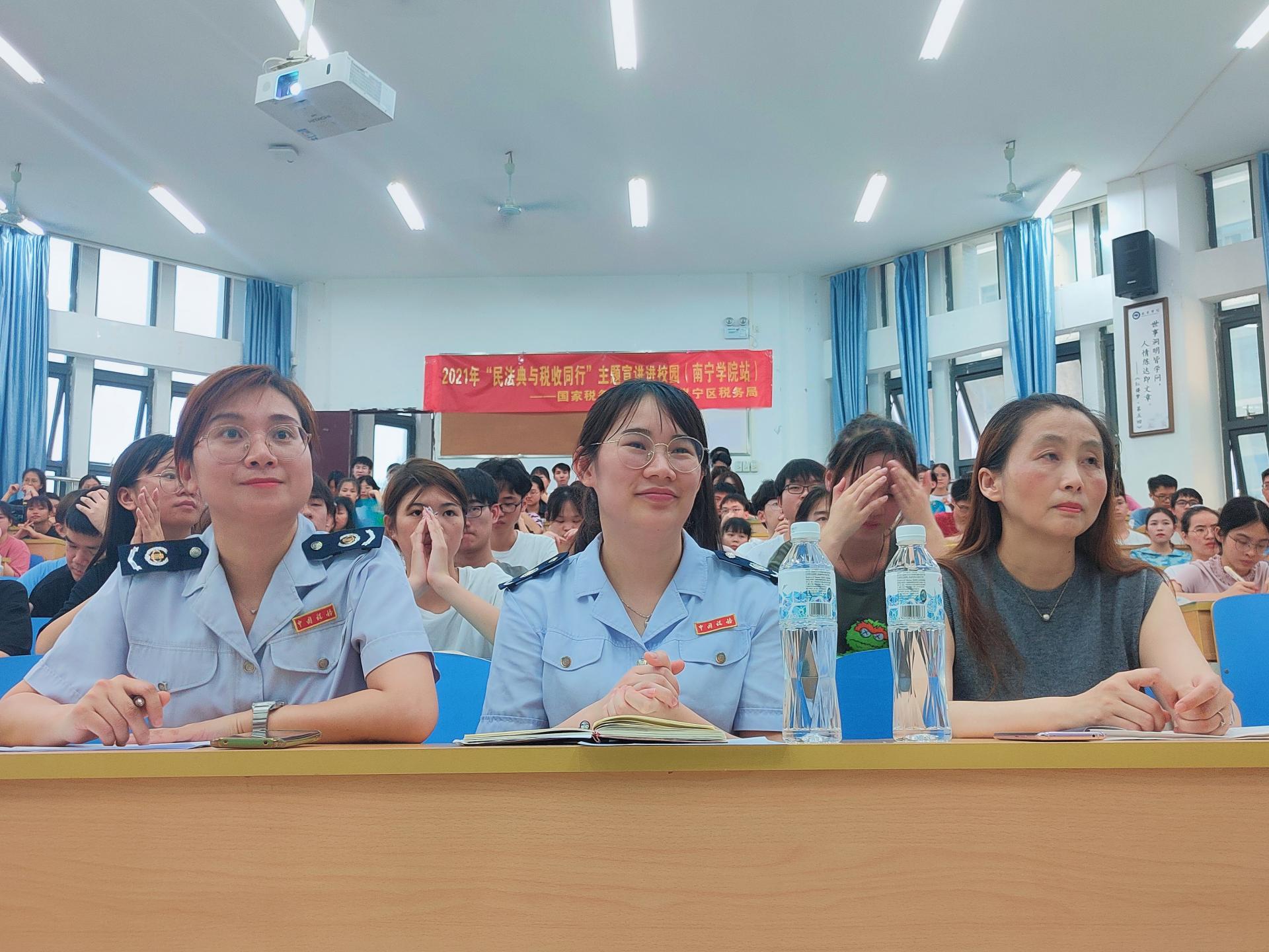 为深入学习贯彻习近平总书记法治思想,增强青少年法制意识,2021624日晚,通识教育学院在敷文园A211面向全校师生举办了一场敷文学堂之民法典与税收同行主题宣讲活动。本次宣讲活动由国家税务总局南宁市邕宁区税务局公职律师牟璎主讲,南宁学院通识教育学院人文教研室主任樊原朱主持。邕宁区税务局法制股副股长于嫣嫣、邕宁区第一税务分局副局长庞雨薇、南宁学院教务处资源管理科科长廖上源、管理学院专职教师薛璐及邕宁区税务分局工作人员和200余名学生参加本次活动。