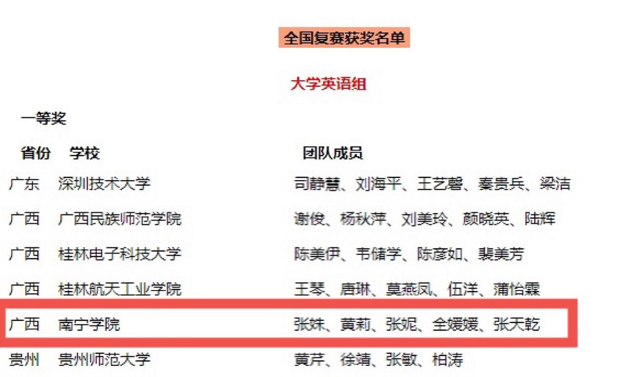 日前, 2021年外研社“教学之星”大赛复赛结果揭晓, 由张姝、黄莉、张妮、全媛媛、张天乾组成的大学英语参赛团队斩获本届大赛复赛一等奖。