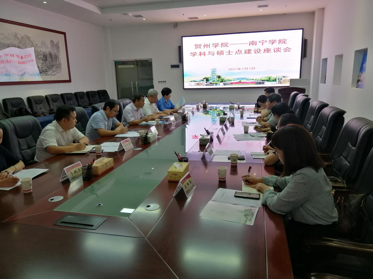 李陶深副校长高度赞扬贺州学院近几年的办学成果,表达了此次交流学习的 主要目的。他指出,南宁学院2019年通过本科教学工作合格评估,学校在“十四五”时期需要制定一条科学合理的发展道路,南宁市政府已将“对标推进南宁学院创建为南宁大学”写入南宁市“十四五”发展规划,学校在师资队伍、科研水平等方面都面临较大挑战;同时因为本科办学积淀不厚,在学位点与学科建设上经验不足,此次交流学习希望贺州学院能够从多角度对我校学位点与学科建设提出宝贵意见,尤其是师资队伍建设及科研水平提升方面给予有效指导。
