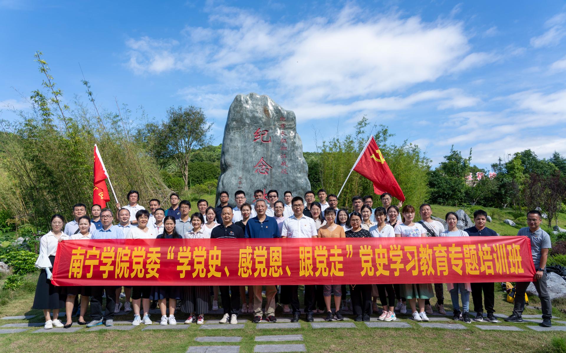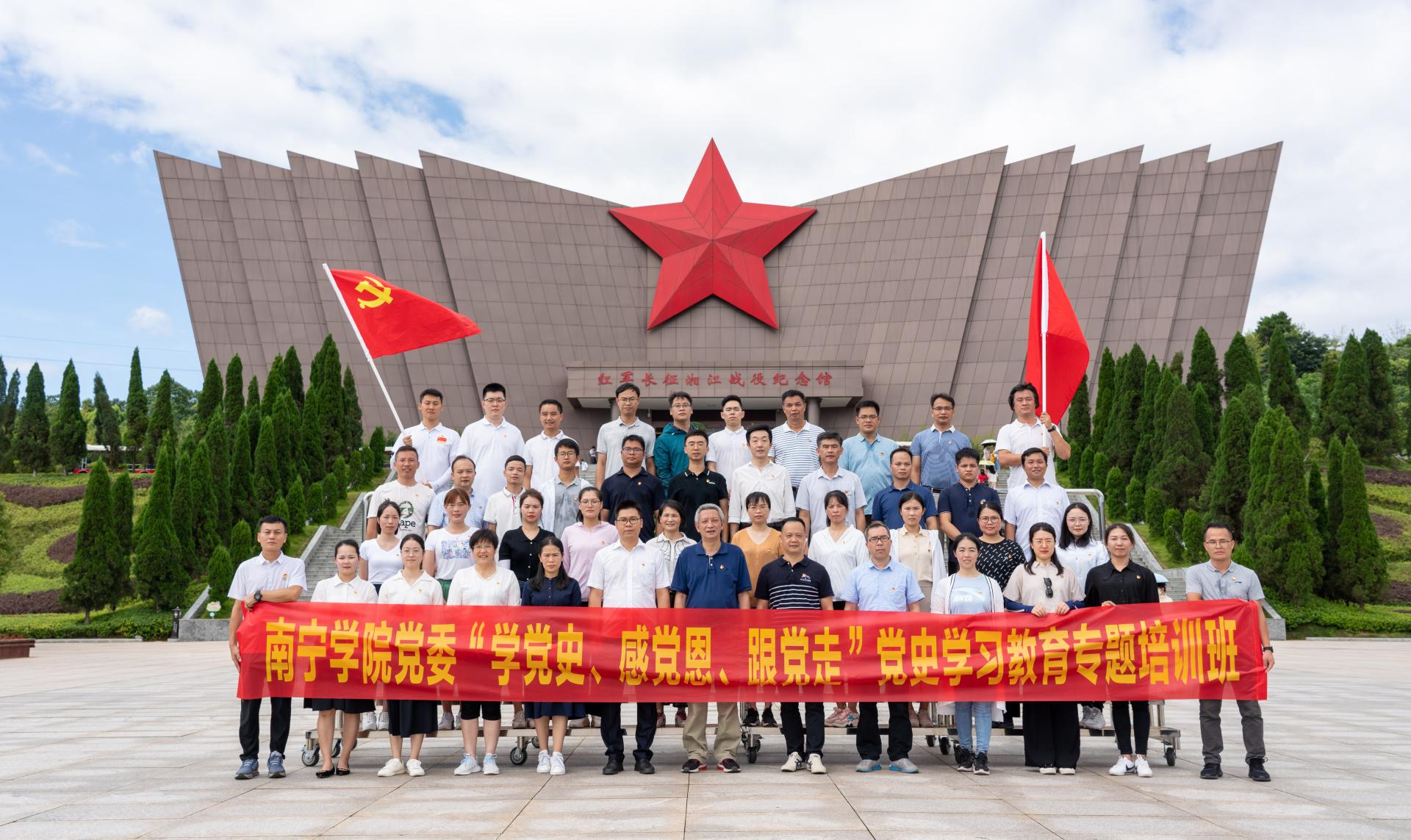 情景教学环节,培训班在党委委员、副校长文旭光的率领下,前往全州红军长征湘江战役纪念园、大坪渡口、华江红军标语楼、兴安县华江瑶族同仁村小红军烈士墓、老山界等红色革命教育基地,聆听党史故事、感受红色历史、感悟革命精神,缅怀革命先烈,接受革命传统教育。