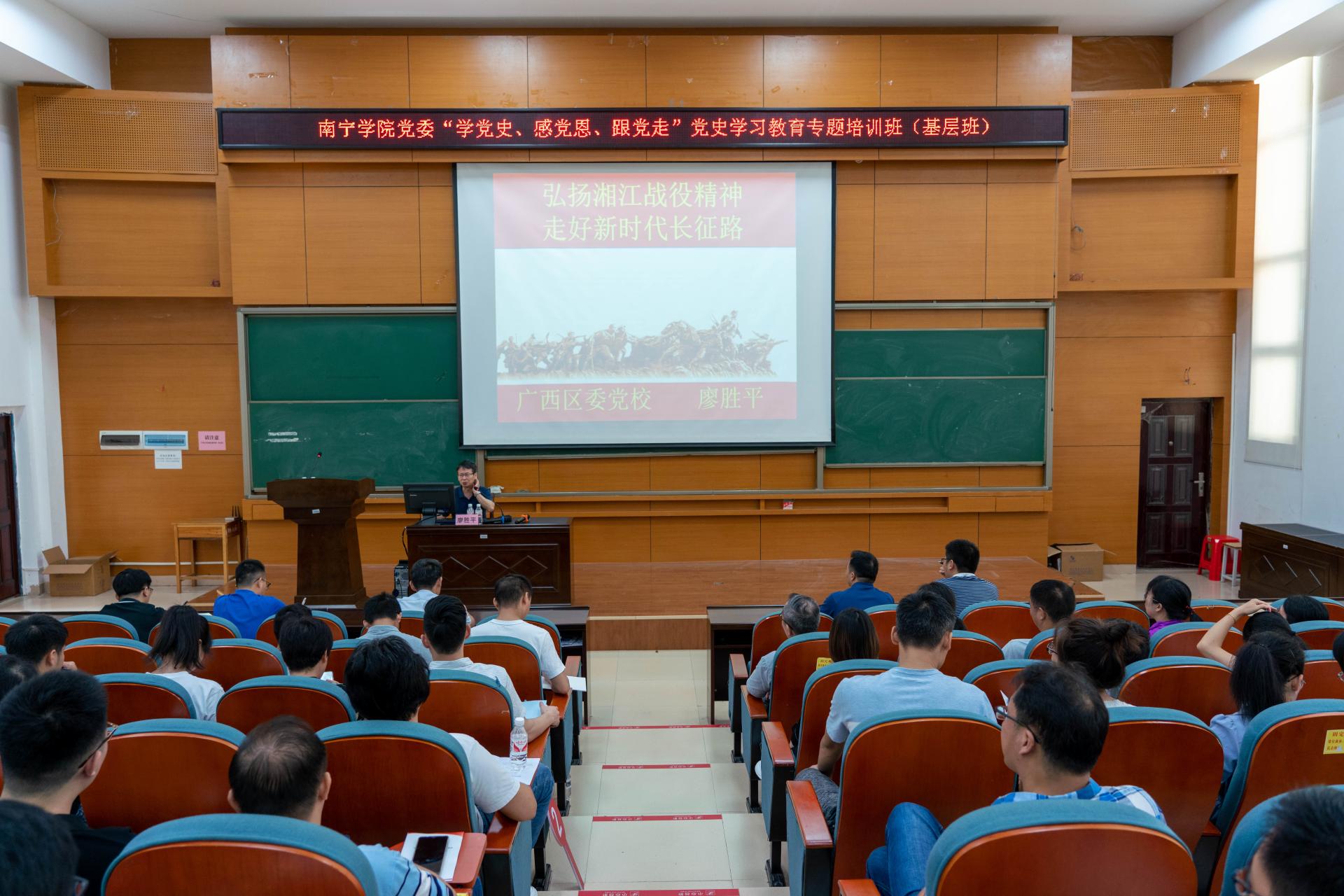 理论教学环节,学校党委邀请区委党校廖胜平教授为学员们作《弘扬湘江战役精神 走好新时代长征路》主题讲座。廖胜平教授从湘江战役的历史背景、湘江战役的经过及主要战斗、突破湘江的历史意义、湘江战役精神的现实价值四个方面进行讲述,让学员们对湘江战役有了全面正确的认识,为到全州进行现场教学打下较好的基础。
