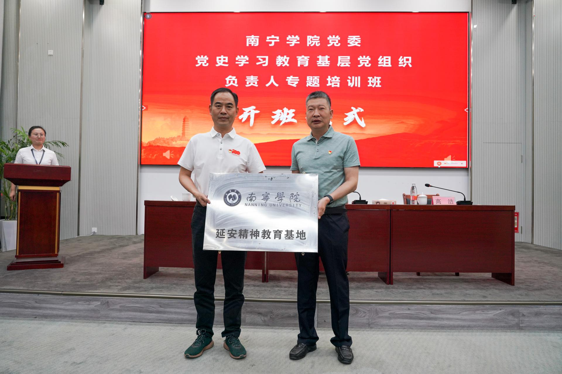 开班典礼上进行授牌仪式。李栋学校长向高洁董事长授“南宁学院延安精神教育基地”牌匾,这标志着山丹丹红培与南宁学院长期友好合作的开始,双方将通过进一步搭建红色培训合作平台,实现红色资源与高校党建的有机结合,为共同传承好红色基因开辟新路径。