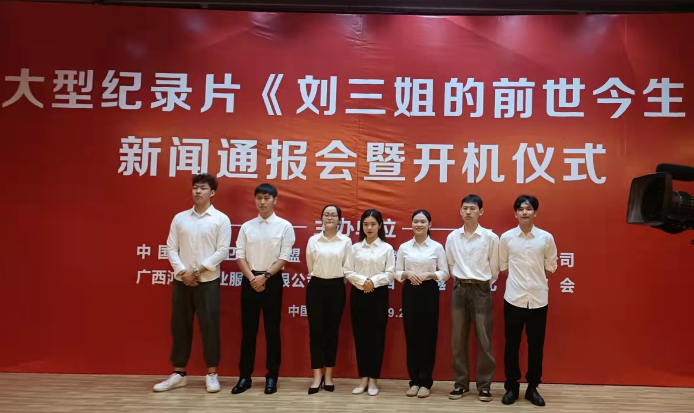 2021年9月26日,由中国国际卫视东盟台、广西微映视觉文化传媒有限公司、广西鸿达物业服务有限公司、广西骆越文化研究会联合策划拍摄的大型纪录片《刘三姐的前世今生》在广西天妃商务酒店举行新闻通报会暨开机仪式。有关市领导、宣传文旅部门的负责人、刘三姐剧目扮演者、刘三姐歌谣文化传承人和著名民间山歌手等出席通报会。我校通识教育学院大学外语教研室黄少政教授及其带队指导的刘三姐歌谣英文演唱队也应邀参加此次活动。