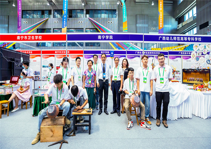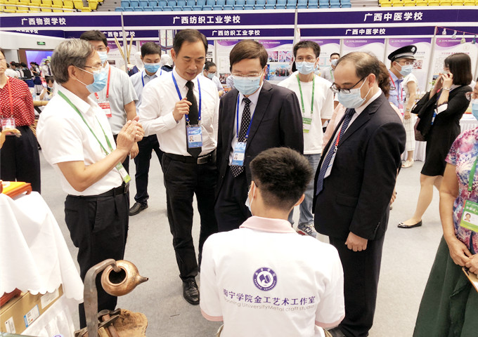 广西壮族自治区教育厅厅长刘友谊、自治区教育厅对外交流合作处处长罗耀光等领导嘉宾到我校展区参观指导。艺术设计学院师生展示了工艺美术、环境设计、视觉传达三个本科专业关于民族文化技艺——南宁红陶、核桃雕刻、金属锻制以及传统民居建筑等入选广西非物质文化遗产代表项目名录的技艺。李栋学校长亲临现场指导,并向巡展的嘉宾介绍我校关于民族文化传承教育教学情况,推介我校传统技艺的传承与创新成果,引导到场的嘉宾观看、体验民族文化技艺现场演示及制作过程。我校展品弘扬传统民族非遗技艺,与现代审美结合,在场的自治区教育厅领导、高校同行、企业代表及国外嘉宾兴趣盎然,一边观看一边提问。我们的展区还获得南宁晚报新闻记者的专门采访。国际交流处韦平处长、艺术设计学院杨伦超院长以及指导教师陪同参观。