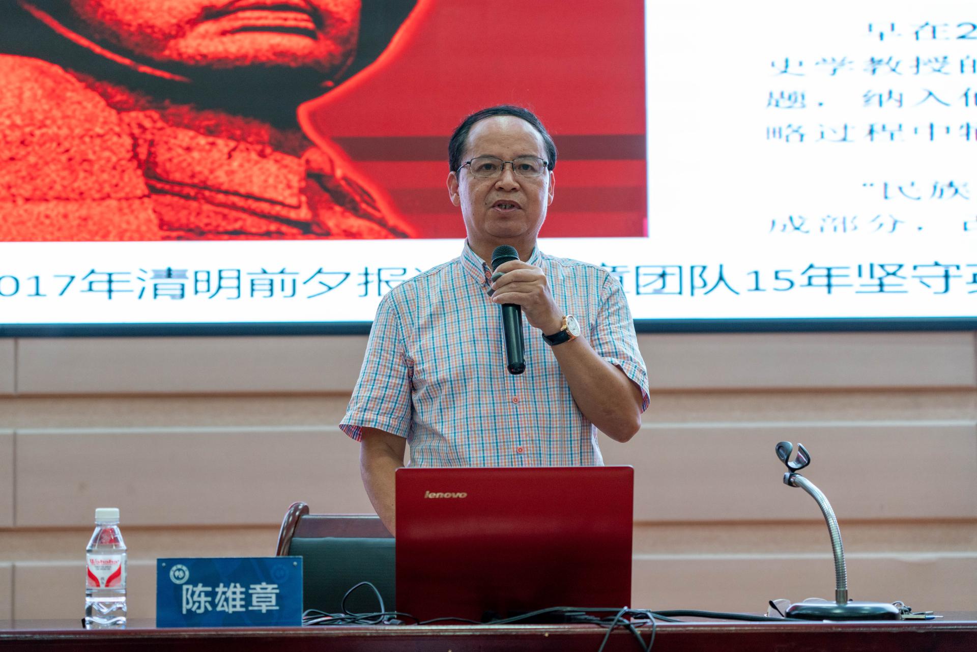 陈教授本次讲座分为三个篇章。讲座的第一篇章:新时代呼唤英雄正气,新时代呼吁新的使命与担当。针对当前存在对革命英烈恶搞抹黑、玷污丑化、破坏名誉等社会现象,陈雄章教授呼吁广大青年学生要用正确的历史观去反思这段革命流血史,积极响应习近平总书记的号召:“崇尚英雄,捍卫英雄,学习英雄,关爱英雄”。把崇尚英雄正气,弘扬英雄精神作为我们时代的正确价值追求。讲座的第二篇章:为有牺牲多壮志。陈教授对百年中共党史进行分期,以扎实的研究、深厚的感情、详尽的史料,鲜活地讲述了中国共产党人不怕困难,敢于牺牲的悲痛壮举,一幅幅震撼的图片,一个个感人的故事……在场的师生潸然泪下,无一不为之动容。第三篇章:英雄正气背后的人文情怀。陈教授以图片、视频展示了战争给英烈家庭带来的无法抚平伤痛,通过对英烈家属故事的讲述,唤醒师生对英雄正气背后的人文情怀深刻思考,倡议广大师生对英烈家属给予社会的人文关怀。