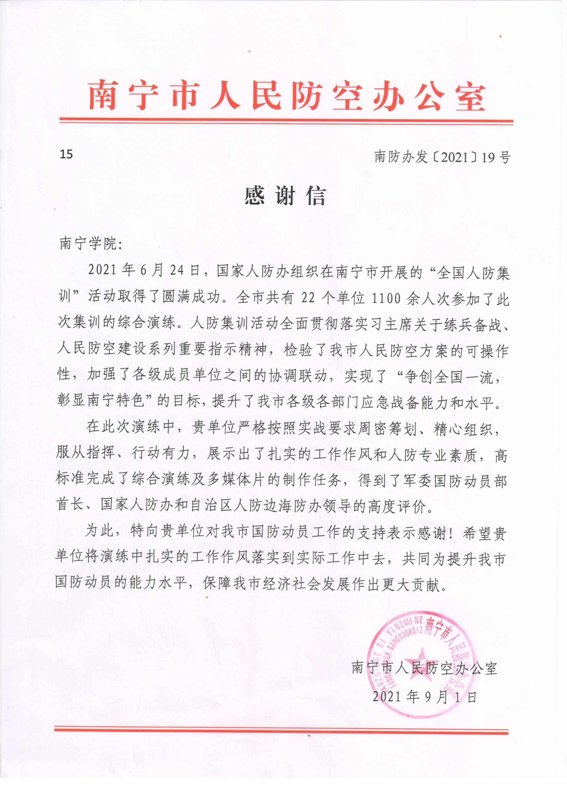 南宁学院收到南宁市人民防空办公室感谢信