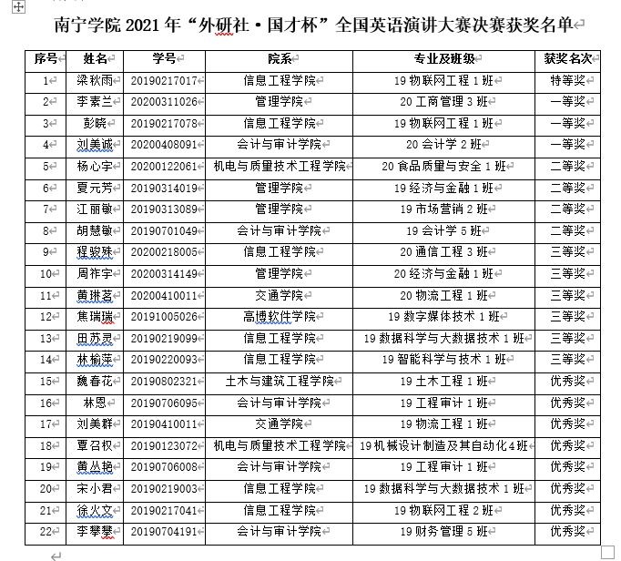 2021年10月15日,由外语教学与研究出版社和中国外语与教育研究中心联合主办、南宁学院通识教育学院大学外语教研室承办的“2021年‘外研社·国才杯’全国英语演讲大赛”南宁学院决赛圆满落幕。在全国庆祝建党100周年之际,本次大赛以“红星照耀中国(Red Star Over China)”为主题,激发学生们回顾党史,爱党爱国,以党为星,照亮前程,砥砺奋进,谱写新华章。