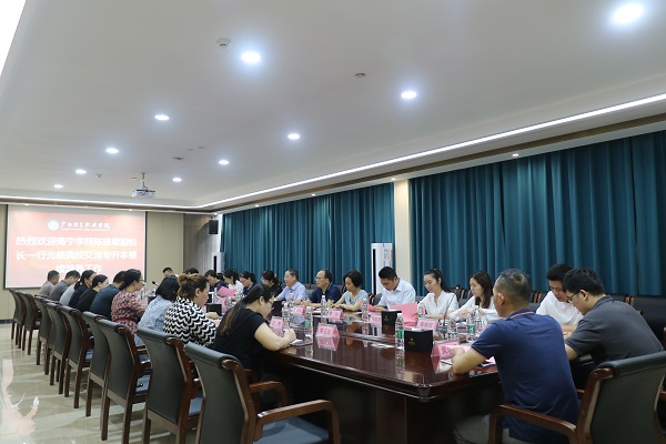 4月28日上午,为了进一步完善专升本人才接续培养方案,持续提升人才培养质量,我校陈雄章副校长率规划处、教务处和艺术与设计学院、商学院、食品与质量工程学院、交通与运输学院、数字经济学院、信息工程学院、人工智能学院、高博软件学院等二级学院领导、工作人员一行16人赴广西演艺职业学院交流专升本人才接续培养工作,受到广西演艺职业学院副校长潘显新等热情接待。