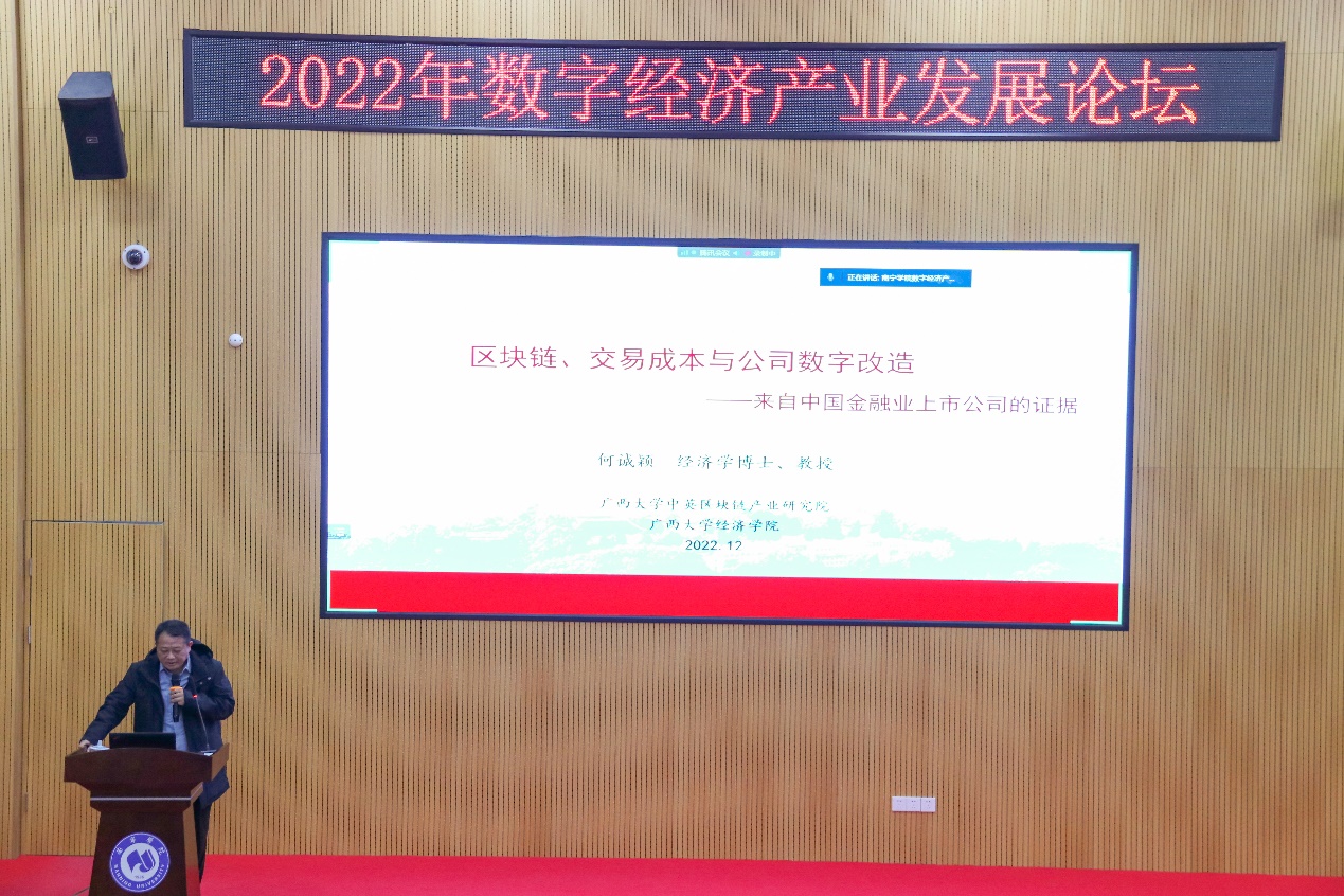 广西大学经济学院学术院长何诚颖教授作《区块链、交易成本与公司数字化改造——来自中国金融上市公司的证据》主题发言