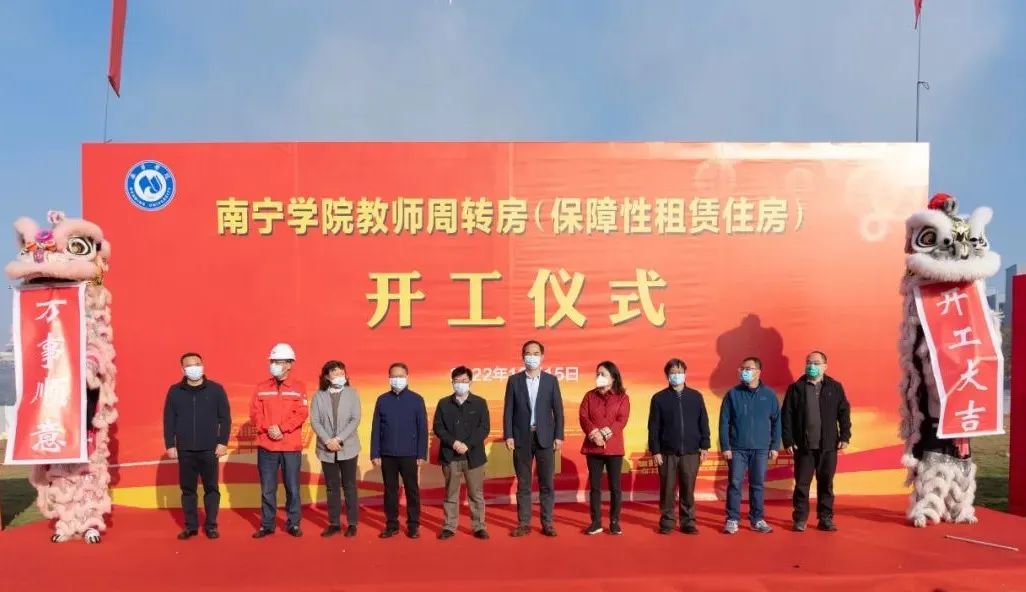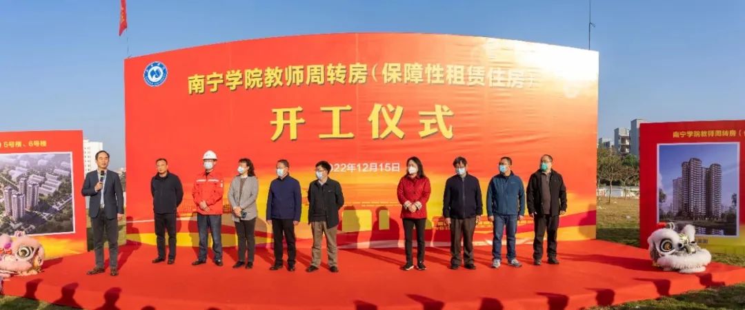 12月15日上午,南宁学院教师周转房(保障性租赁住房)开工仪式在学校项目施工现场顺利举行,南宁学院全体校领导,南宁威宁房地产开发有限公司、南宁威宁建设投资有限责任公司、广西有色勘察设计研究院等单位领导及学校各单位、部门负责人及教代会代表参加开工仪式。开工仪式由南宁学院副校长、工会主席龚击主持。