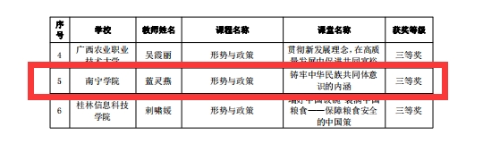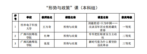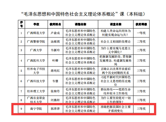 为进一步推动习近平新时代中国特色社会主义思想进教材、进课堂、进头脑,20227月至12月,自治区党委教育工委、自治区教育厅组织开展了全区高校学习习近平新时代中国特色社会主义思想示范课堂(以下简称“示范课堂”)遴选认定工作,并于2022年12月9日公布评比结果,全区共认定100堂“示范课堂”获奖。我校思想政治理论课建设三门课程的课堂获奖,董艳老师在“习近平新时代中国特色社会主义思想概论”课(本科组)荣获二等奖,郭萍萍老师在“毛泽东思想和中国特色社会主义理论体系概论”课(本科组)荣获三等奖,蓝灵燕老师在“形势与政策”课(本科组)荣获三等奖。