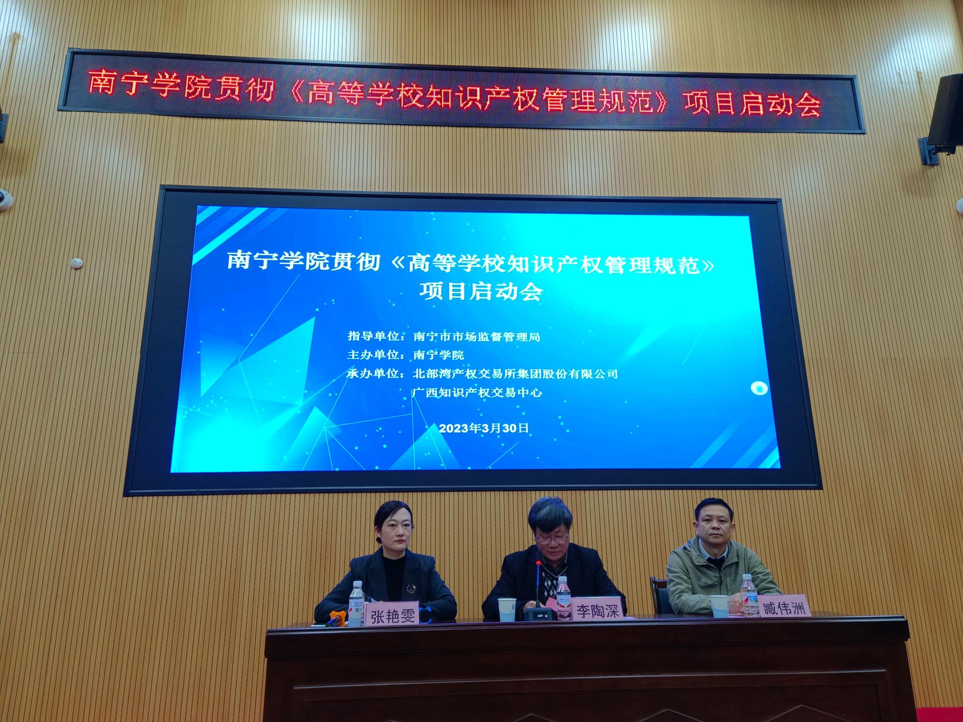2023年3月30日,南宁学院在敷文园A108会议室举办了贯彻《高等学校知识产权管理规范》项目启动会,本次活动由南宁市市场监督管理局指导,南宁学院主办,北部湾产权交易所集团、广西知识产权交易中心承办。参加启动会的有:南宁学院副校长李陶深、南宁市市场监督管理局四级调研员臧伟洲、南宁市市场监督管理局产权促进科副科长邓娴、北部湾产权交易所集团股份有限公司知识产权交易中心综合服务部副总经理陈健、广州科创知识产权咨询有限公司副总经理姚大奎、南宁学院各二级学院、各职能处室领导和老师学生代表,启动会由科研与学科建设处处长张艳雯主持。