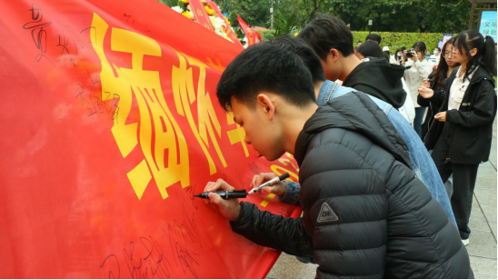 同学们在主题横幅上签名