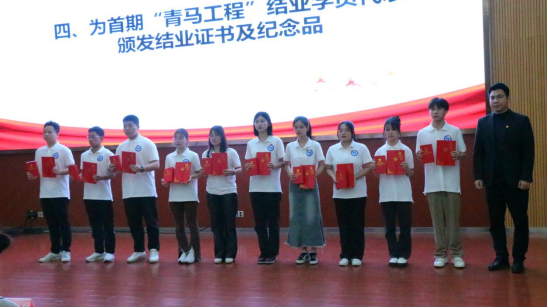 仪式上,南宁学院首期青马班培训班结业学员代表、广西区青马班学员罗海娇上台发言,她从首期青马班的课程理论学习和实践活动过程分享感悟和体会,表示在课程学习的过程当中让她更加坚守爱国初心,坚定理想信念,并且能够激发她主动在学习锤炼自身本领,勇于投身实践,希望在今后能够继续发挥先锋模范作用,担当起时代使命。随后在仪式上,校团委书记、人工智能学院党总支书记、副院长李志为首期结业学员代表颁发了结业证书及纪念品。