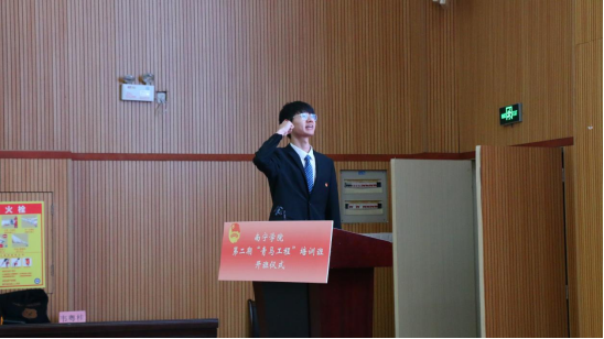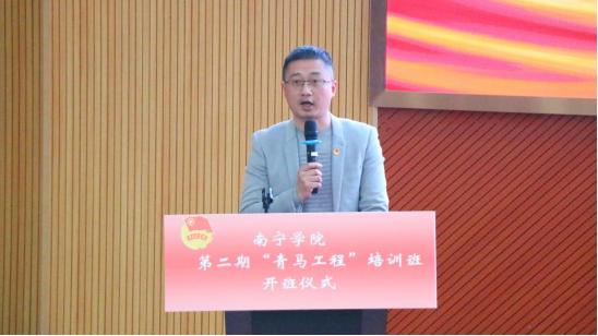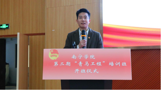 仪式上,学工部副部长刘波为首期青马班培训班学员结业暨第二期培训班开班致词,刘副部长对首期青马班学员顺利结业和对第二期学员顺利加入表示祝贺,他希望青马班学员无论在何时何地都能将自己所学所得带回基层,牢记责任和使命,继续发挥更大的影响力,同时他还对第二期青马班培训班学员提三点希望,即希望学员能讲政治,树理想,不断丰富自己的内涵,其次是能够知奉献,敢担当,描绘出青年的鲜明底色,还要严作风,守纪律,成为一支铁打的队伍,他还希望希望学员们能够牢记总书记的殷切希望,不断追求进步、争当先进,当好党的助手和后备军,争当堪当大任的新时代青年。致词后,学工部副部长刘波将青马班班旗授予了第二期青马班培训班学员代表,标志着南宁学院第二期青马班培训班正式开班。