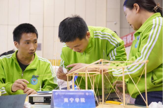 据统计,此次竞赛全国共计超过550所高校、1100支队伍参与了分区赛选拔。我校参赛选手在黄家聪老师和梁小光老师指导下,经过广西分区赛选拔,以广西唯一一所本科高校的身份参加国赛。本次大赛题目模型采用以三重木塔结构为基本单元,要求参赛者针对竖向荷载、扭转荷载及水平荷载等多种荷载工况下的空间结构进行受力分析、模型制作及加载试验。参赛选手需要在模型制作、陈述答辩、模型加载3个环节展开激烈角逐,竞争奖项。