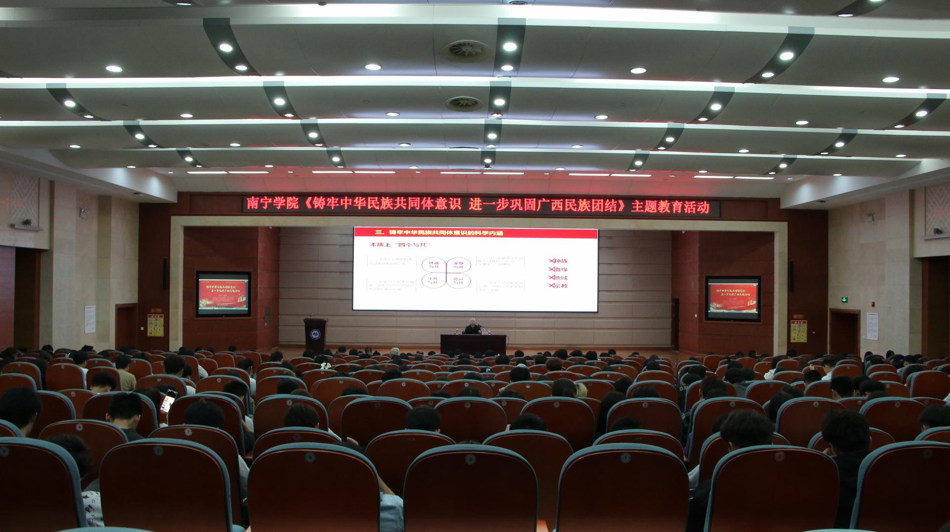 农辉锋教授以《铸牢中华民族共同体意识进一步巩固广西民族团结》为题,从精准把握铸牢中华民族共同体意识丰富内涵、深刻把握广西推进民族团结的基本经验、精准把握进一步巩固广西民族团结的路径选择三个方面进行讲授,深入剖析中华民族共同体意识形成的社会历史条件,解释了“铸牢中华民族共同体意识”提出的过程、科学内涵及其重大意义。农教授还从广西民族概况、民族文化的格局、推进民族团结的基本经验分析了广西各民族之间的文化发展情况,增进了参会师生对广西民族文化的深入了解,从中明确广西推进民族团结的基本经验。在进一步巩固广西民族团结的路径选择上,他指出要在构筑中华民族共有精神家园上干在实处、走在前列,在推动各民族共同走向社会主义现代化上率先突破、取得实效,在促进各民族交往交流交融上创新推进、再创佳绩,在提升民族事务治理体系和治理能力现代化水平上开拓进取、再上台阶,在坚决防范民族领域重大风险隐患,维护民族团结和边疆安宁上彰显新担当、作出新贡献。在授课过程中,农教授用大量丰富的图文、数据进行展示,多角度、多层次把铸牢中华民族共同体意识教育带进校园,深入我校师生心中。