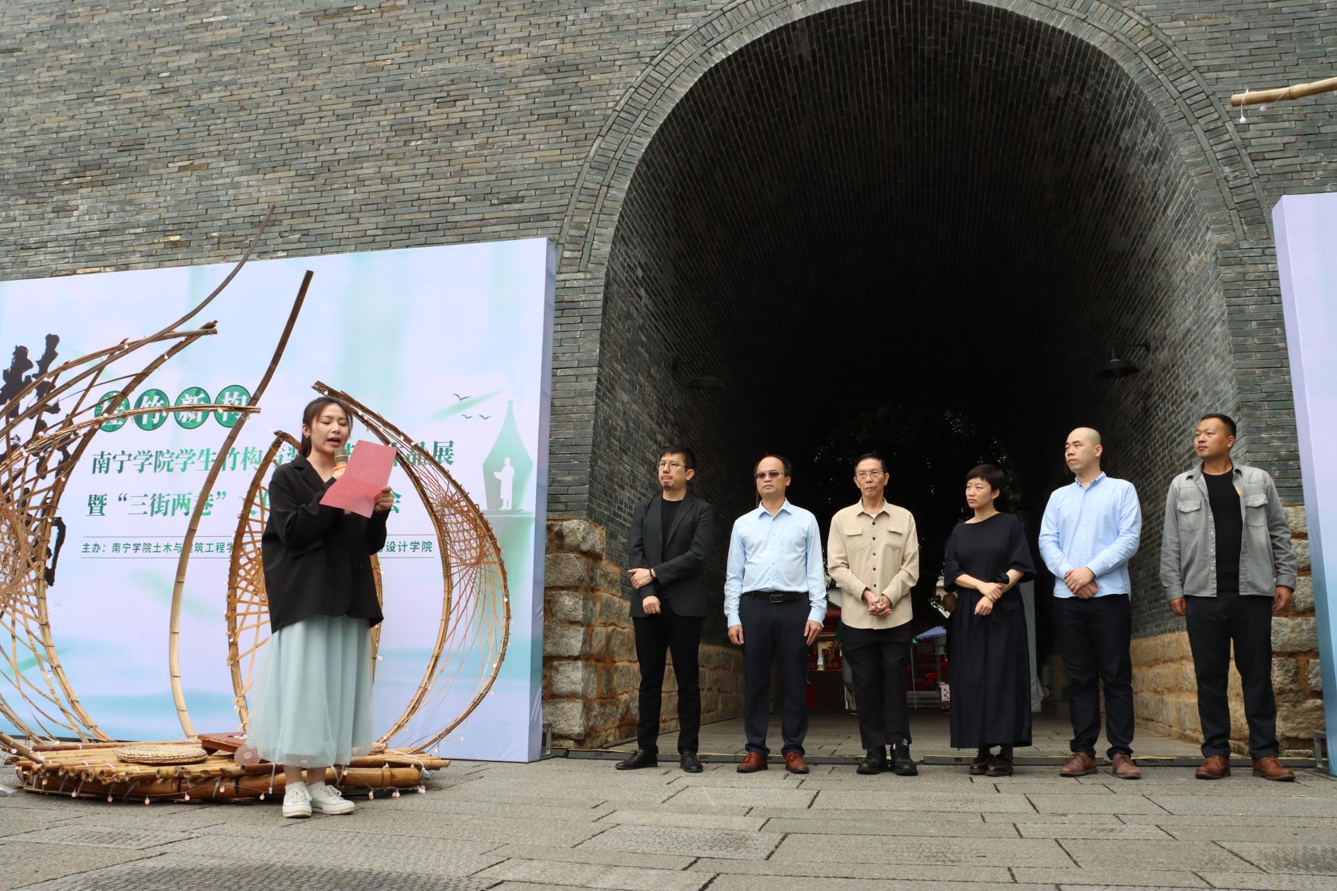 南宁学院土木与建筑工程学院党委书记、执行院长沈建增;南宁学院艺术与设计学院副院长徐党卿;“陈说往事”公众号博主、资深城市文化学者陈建昭;华蓝设计(集团)有限公司庞波建筑总师工作室副总建筑师、三街两巷二期执行设总容泽康;自在生成设计事务所创始人欧阳李文;南宁学院艺术设计学院教授级高级工程师黄宇,以及南宁学院土木与建筑工程学院和艺术与设计学院的师生们出席了开幕仪式并参观竹构与装饰艺术作品、建筑学专业和环境设计专业课程作品展。
