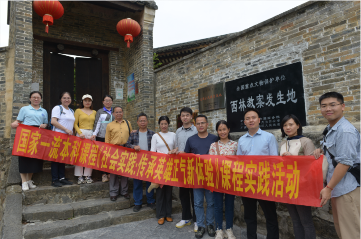 课程组第二站来到第八批全国重点文物保护单位——西林教案发生地调研,“西林教案”是中国近代史上震惊中外的重大历史事件,是第二次鸦片战争的导火索之一。第一次鸦片战争后,西方列强通过一系列不平等条约践踏中国主权,掠夺中国资源,并企图通过宗教对华进行精神上的侵略。1856年,地处桂西一隅的西林县定安镇(今属田林县)人民首先发出了震天的怒吼,举起了反对列强入侵的大旗!新任知县张鸣凤逮捕并处死法国传教士马赖等人,铸就了著名的“西林教案”。陈雄章教授现场教学讲述了两次鸦片战争的历史事件和对中国的影响,对第二次鸦片战争提出三问:国防怎么办?中国人的精神文化怎么办?中国人祖先传下来的国土怎么守?战争结束后清政府启动的洋务运动就是对上述三问的初步回答。陈教授强调,政府要充分发掘利用历史文化资源和价值,高校课程要深入社会,用生动形象的案例、实物培育学生的家国情怀,让师生了解历史、借古通今,通过社会实践传承英雄正气新体验。(通识教育学院供稿 文/课程组 图/陈雄章、韦超才 )