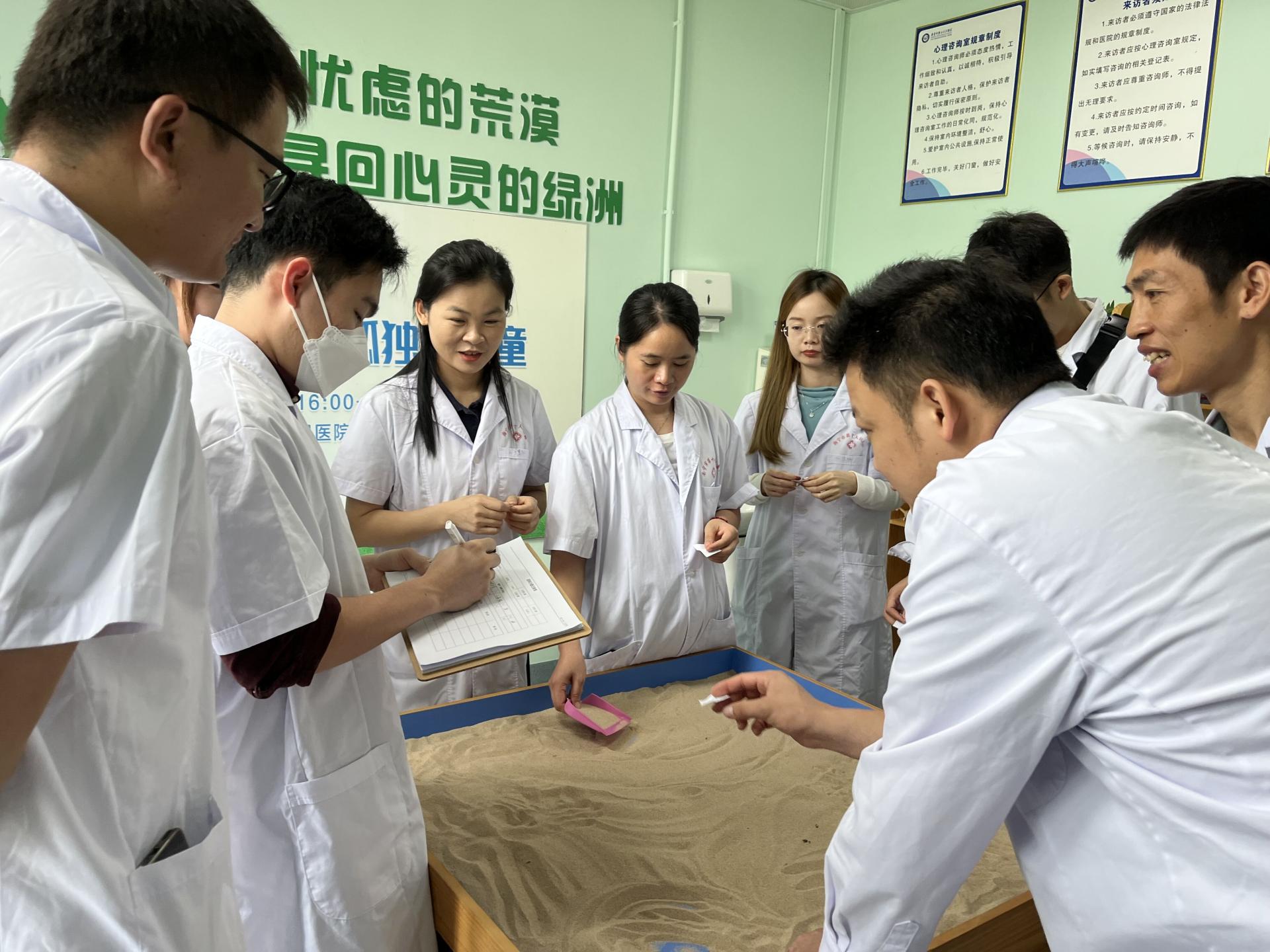 在首日见习活动中,第十人民医院精神心理科主任温健带领老师们进行了常见病例查房、观摩学习和模拟问诊等活动。温主任通过对抑郁症、焦虑症和精神分裂症等病例开展的问诊和咨询,向老师们示范和讲授了心理疾病和精神疾病的诊断标准。次日,在第十人民医院心理咨询师温舒雯医生的指导下,老师们体验了团体沙盘游戏,并学习了沙盘游戏在心理咨询中的应用。最后,老师们跟随温主任参观了病区内的各类治疗室和功能室,深入了解了心理疾病和精神疾病的治疗手段。