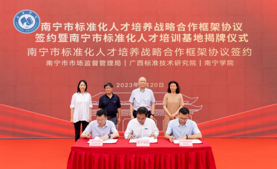 为贯彻落实《国家标准化发展纲要》、《广西贯彻落实〈国家标准化发展纲要〉实施方案》和《南宁市人民政府办公室关于印发南宁市高质量实施区域全面经济伙伴关系协定工作方案(2022—2025年)的通知》等文件关于培养复合型国际标准化人才等部署要求,全力服务南宁市经济社会高质量发展,进一步深化产教融合,密切合作,5月20日上午,我校与南宁市市场监管局、广西标准技术研究院在学校行政楼南广场举行了南宁市标准化人才培训基地揭牌仪式活动。仪式上,三方共同签署了《标准化人才培养战略合作框架协议》,揭牌成立了“南宁市标准化人才培训基地”,基地落户南宁学院,正式启动了标准化人才培养“政、研、校”合作模式。广西壮族自治区市场监督管理局党组成员、总工程师李暄,广西标准技术研究院院长蔡旭平,南宁市市场监督管理局党组成员、副局长谢义平,广西标准技术研究院副院长林建业等领导嘉宾以及学校校长李栋学、副校长李陶深、龚击,纪委书记曹文军等学校领导出席和见证了活动。活动由学校副校长陈雄章主持。