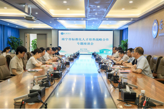 仪式结束后,在学校行政楼400会议室开展了南宁市标准化人才培养战略合作专题座谈会,南宁市市场监督管理局副局长谢义平、广西标准技术研究院副院长林建业、南宁市市场监督管理局标准化科科长马霞、产权促进科科长刘万娴,学校副校长陈雄章、教务处处长胡晓敏、发展规划与合作交流处处长覃凤彩、科研与学科建设处处长张艳雯及食品与质量工程学院领导参加了座谈会。会议由食品与质量工程学院院长庞湘萍主持。