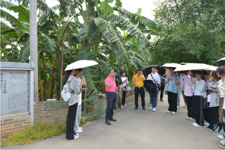 课程组师生第三站走进扬美古镇,这里是广西历史文化名镇之一。陈雄章教授现场讲授了扬美古镇的历史,引导全体师生实地调研思考,了解古镇浓厚的历史文化和人文精神。陈雄章教授指出读懂扬美古镇有“四脉”:第一是“人脉”,扬美古镇虽然不大,但是却包含三十多个姓氏族,足以说明其包容程度之广;第二是“商脉”,明清时期扬美古镇是商业重镇,商业发达并有“小南宁”的美称,这其中最重要的原因是古镇控制着水运,这是一条重要的水上交通枢纽;第三是“文脉”,古镇人们学习儒家文化,出过许多进士,还建有魁星楼和孔庙;第四是革命的“红色之脉”,革命时期这里聚集过很多革命党人,其中有两位重要的领导人物——孙中山和黄兴都来过此地,他们对古镇的革命文化影响深远。陈雄章教授带领全体师生一路走访一路学习,从“根”上领略体验扬美古镇之美,让我们了解古镇的历史文化和传承。