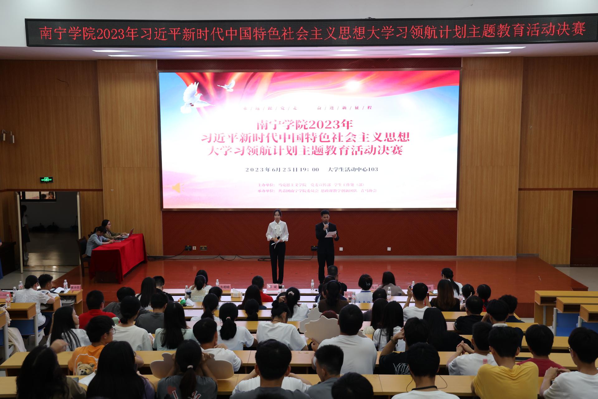 为坚持不懈用习近平新时代中国特色社会主义思想铸魂育人,充分发挥“大思政课”实践教学育人作用,用新时代十年伟大变革的生动实践把道理讲深、讲透、讲活,不断提高思政课的针对性和吸引力,引导学生深刻领悟“两个确立”的决定性意义,增强“四个意识”、坚定“四个自信”、做到“两个维护”,坚定不移听党话、跟党走,2023年3月,学校启动南宁学院2023年习近平新时代中国特色社会主义思想大学习领航计划主题教育活动。历时三个月的运作,6月25日,“领航计划”主题教育活动总决赛在大学生活动中心103举行。