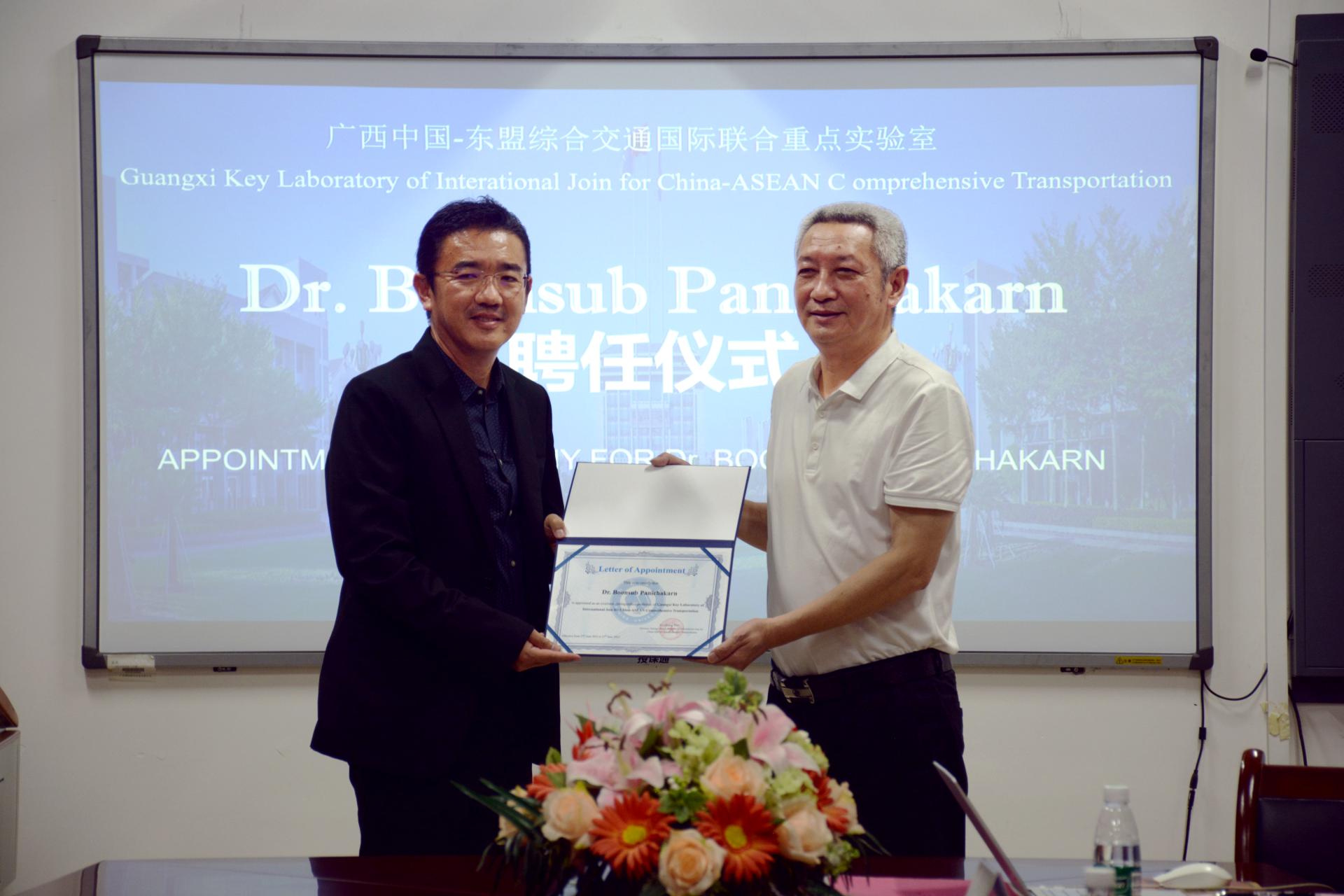 6月26日下午,学术交流座谈会在南硅谷E201室召开。南宁学院广西中国-东盟综合交通国际联合重点实验室主任文旭光教授、副主任陈建球博士、南宁学院交通运输学院院长龚仁喜教授、副院长庞彦知副教授及交通运输学院相关老师参会。双方就未来国际科技合作与人才培养等事宜进行了深入的磋商与沟通。文旭光教授为Boonsub Panichakarn博士颁发了广西中国-东盟综合交通国际联合重点实验室特聘专家证书。