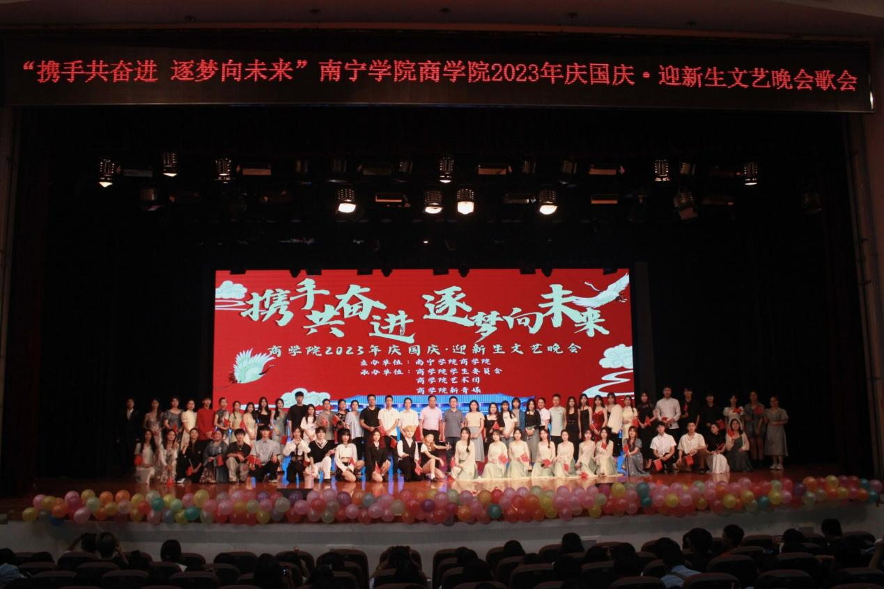 为展现新时代大学生团结拼搏、积极向上的青春风采,进一步坚定“听党话、感党恩、跟党走”的理想信念,值此中秋、国庆佳节来临之际,2023年9月27日,南宁学院商学院在演艺中心举行“携手共奋进 逐梦向未来”商学院2023年庆国庆、迎新生文艺晚会歌会,歌会分为金秋送爽迎八方学子、魅力青春彰青年本色、盛世欢歌颂祖国华诞等三个篇章。