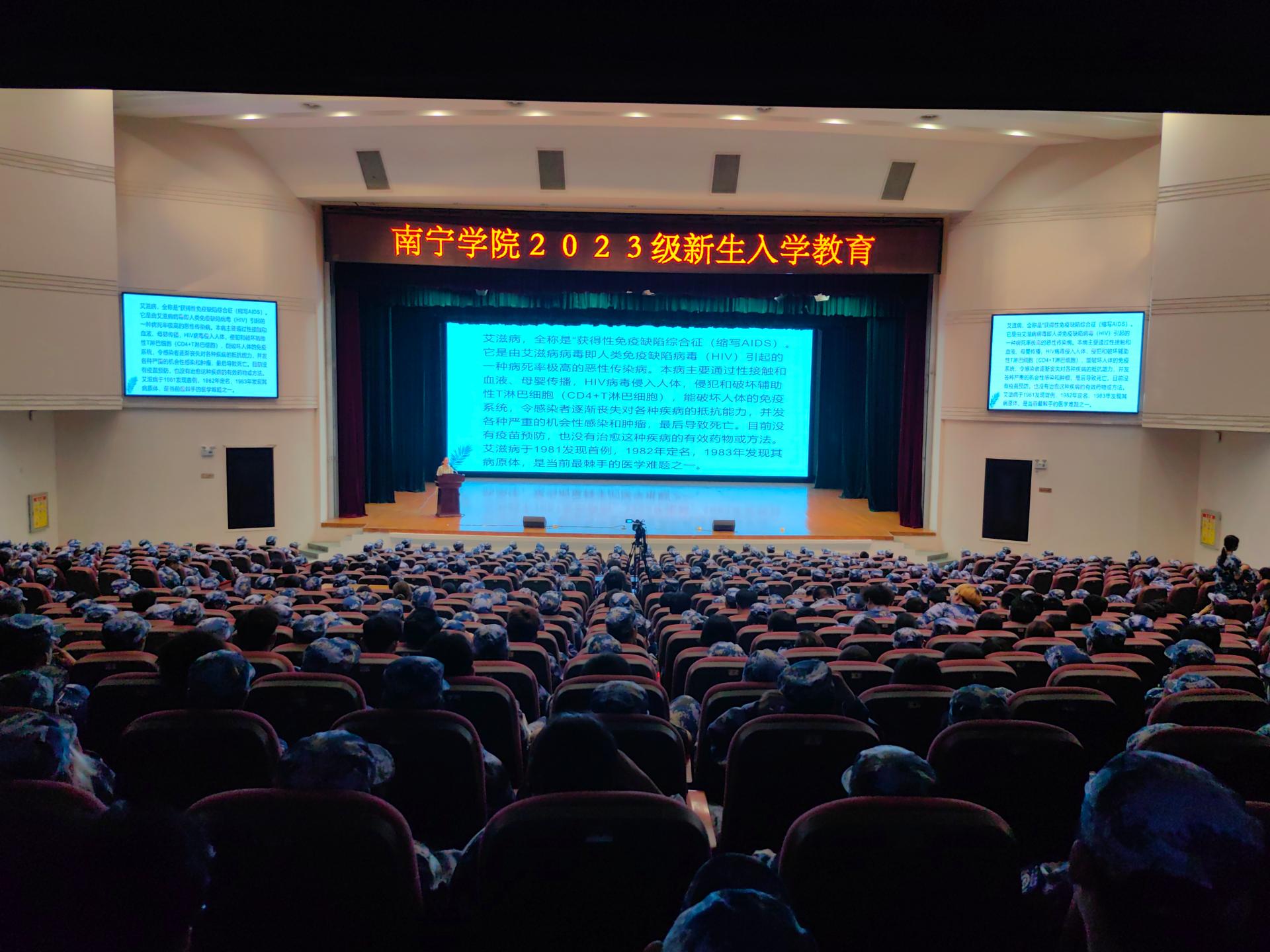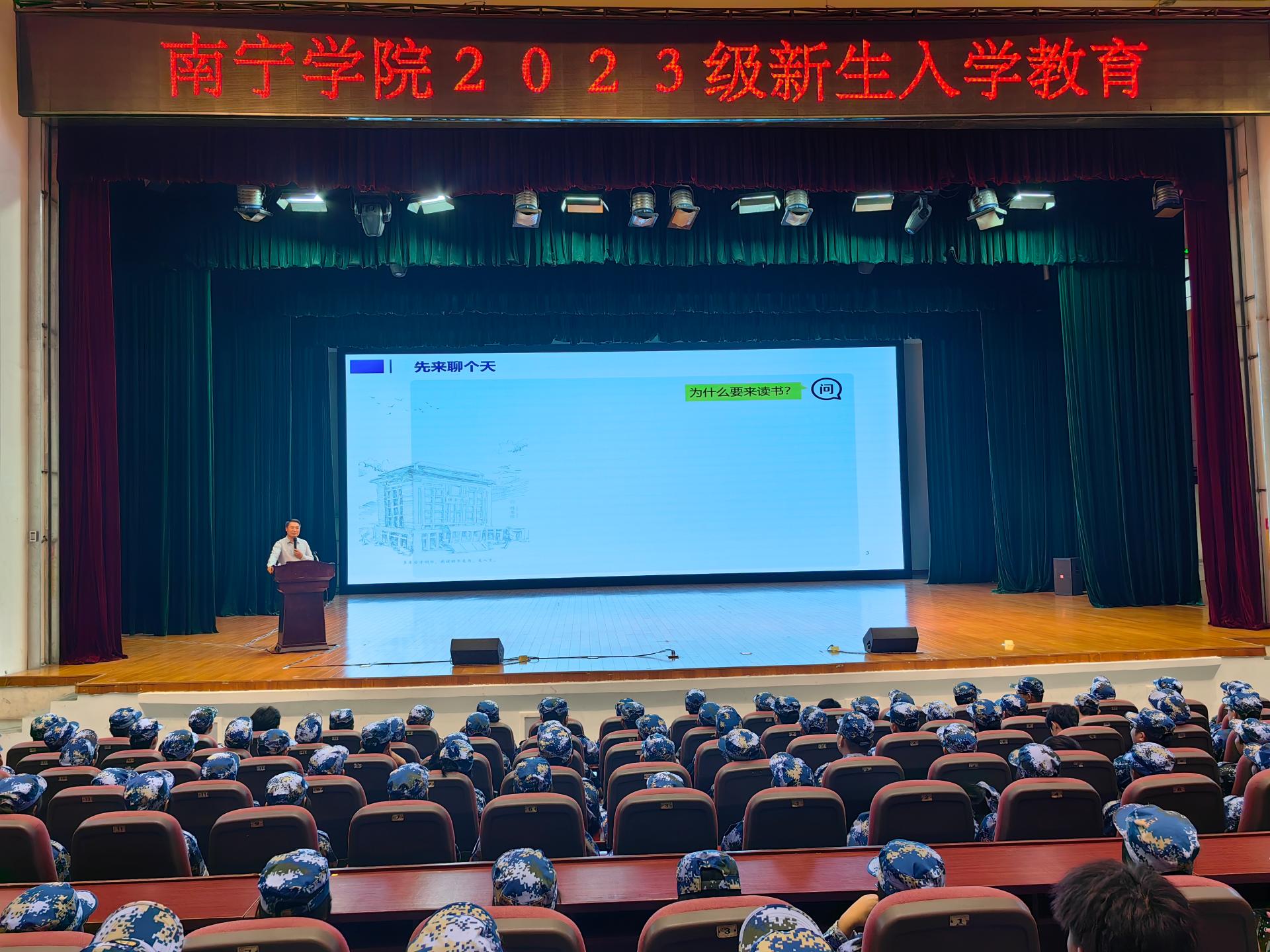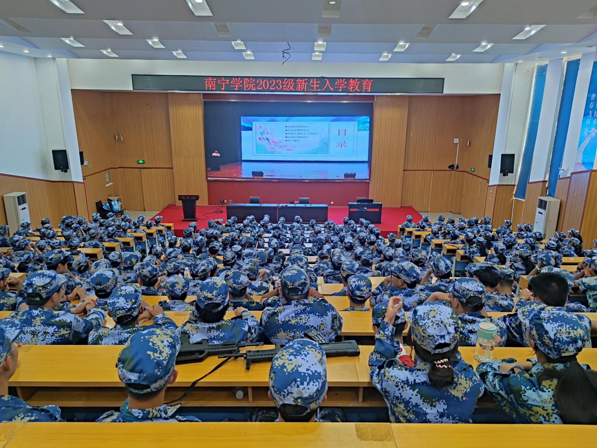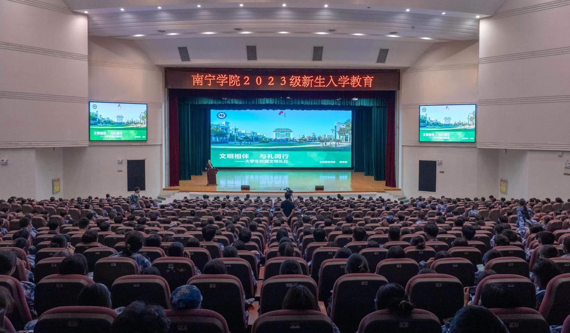 金秋送爽,丹桂飘香,南宁学院2023级新生怀揣着梦想开始了全新的校园生活。为切实做好2023级新生入学教育工作,加强新生思想政治教育,帮助新生学会科学规划学习和生活,提高心理健康素质,增强安全防护意识,顺利完成角色转变,系好大学的第一粒扣子。我校于9月11日-9月19日期间,开展2023级新生入学教育,讲座形式通过在演艺中心开展线下现场培训。同时,在图书馆报告厅、活动中心103、敷文园E104和体育馆等场所开展现场观看线上直播