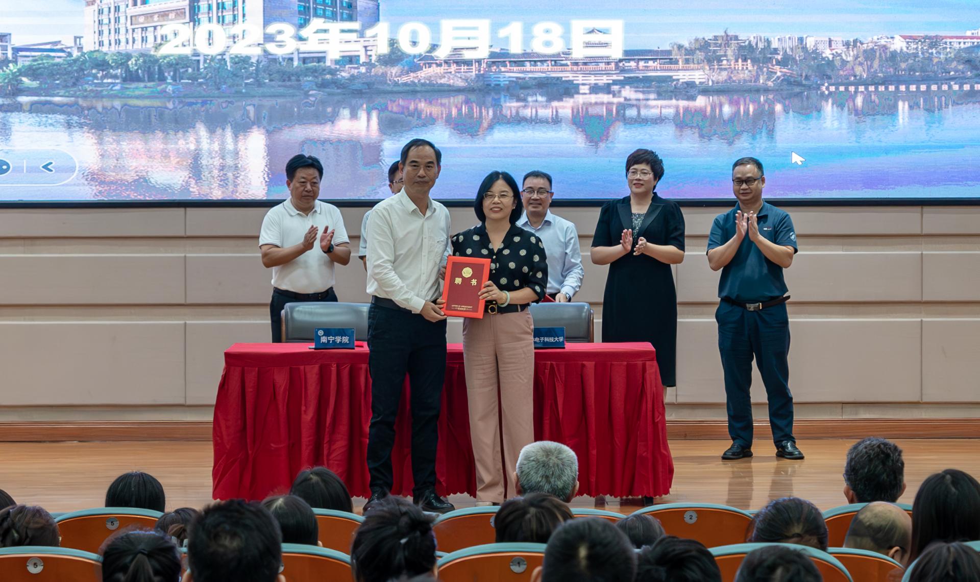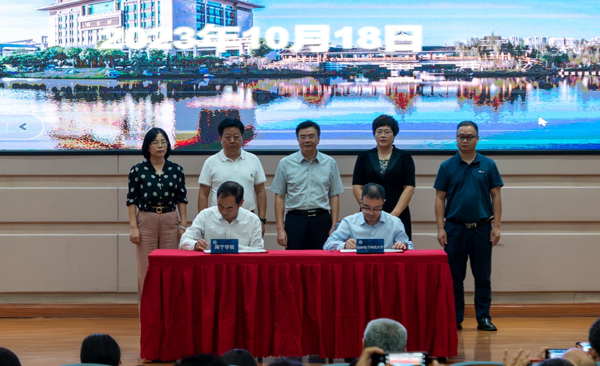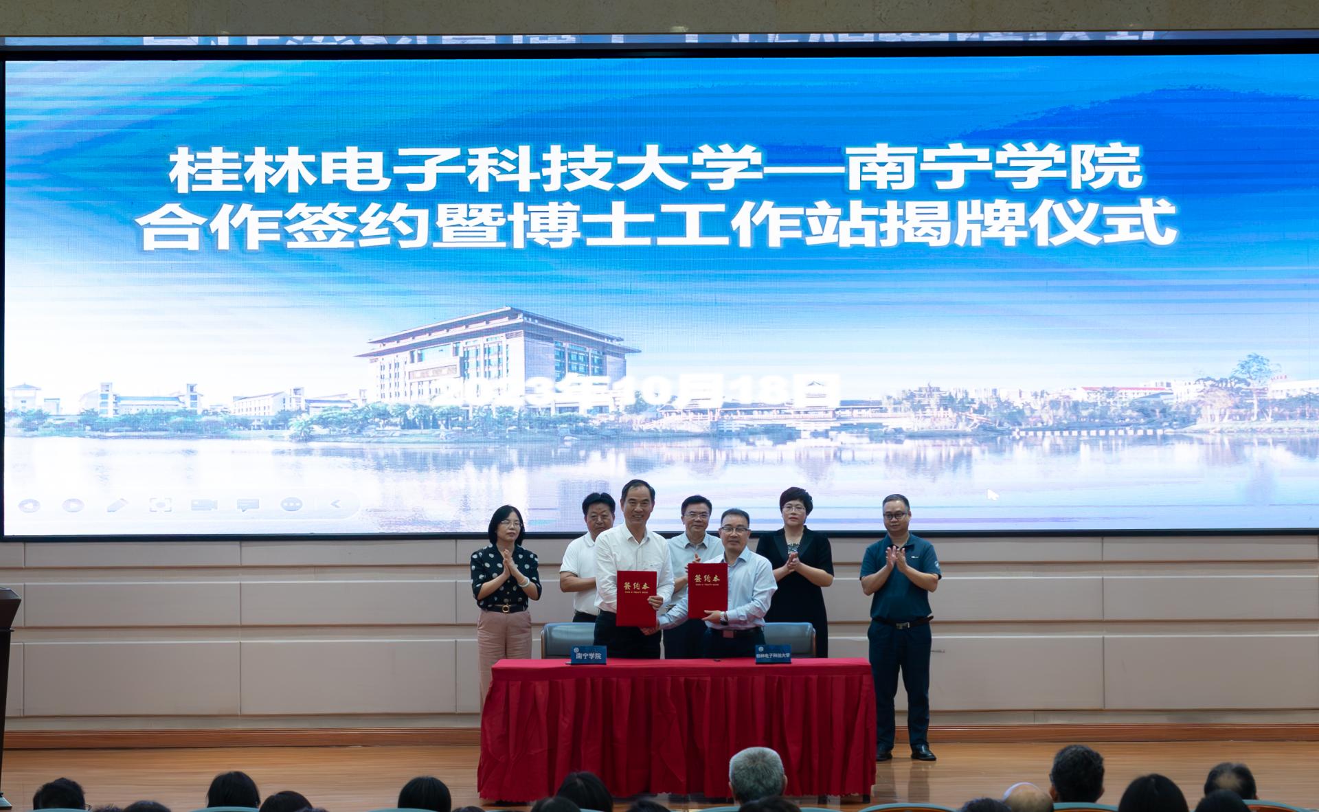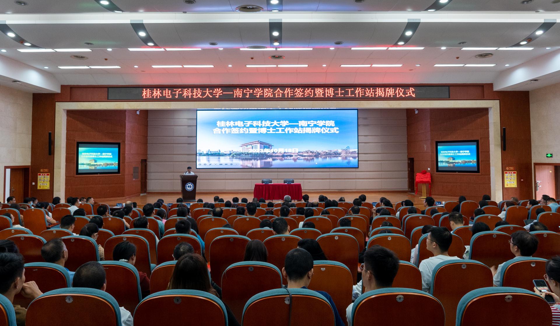 为落实桂林电子科技大学与南宁市人民政府的战略合作部署,深化校地、校校合作,进一步发挥桂林电子科技大学的辐射带动作用、促进南宁学院硕士学位授予单位建设,努力为南宁市落实“强首府”战略进一步夯实人才基础。2023年10月18日,在南宁学院举行桂林电子科技大学—南宁学院合作签约暨博士工作站揭牌仪式。参加揭牌活动的领导嘉宾有:自治区教育厅党组副书记、副厅长、一级巡视员黄雄彪,桂林电子科技大学校长徐华蕊,南宁市委常委、统战部部长、副市长张自英,南宁市政府副秘书长蔡志忠,桂林电子科技大学校长助理、南宁研究院党委副书记、院长孙希延,桂林电子科技大学南宁研究院党委书记刘权辉、桂林电子科技大学南宁研究院学生工作负责人王标;南宁学院李栋学校长以及其他学校领导、中层管理干部、科级管理人员及二级学院教师代表。