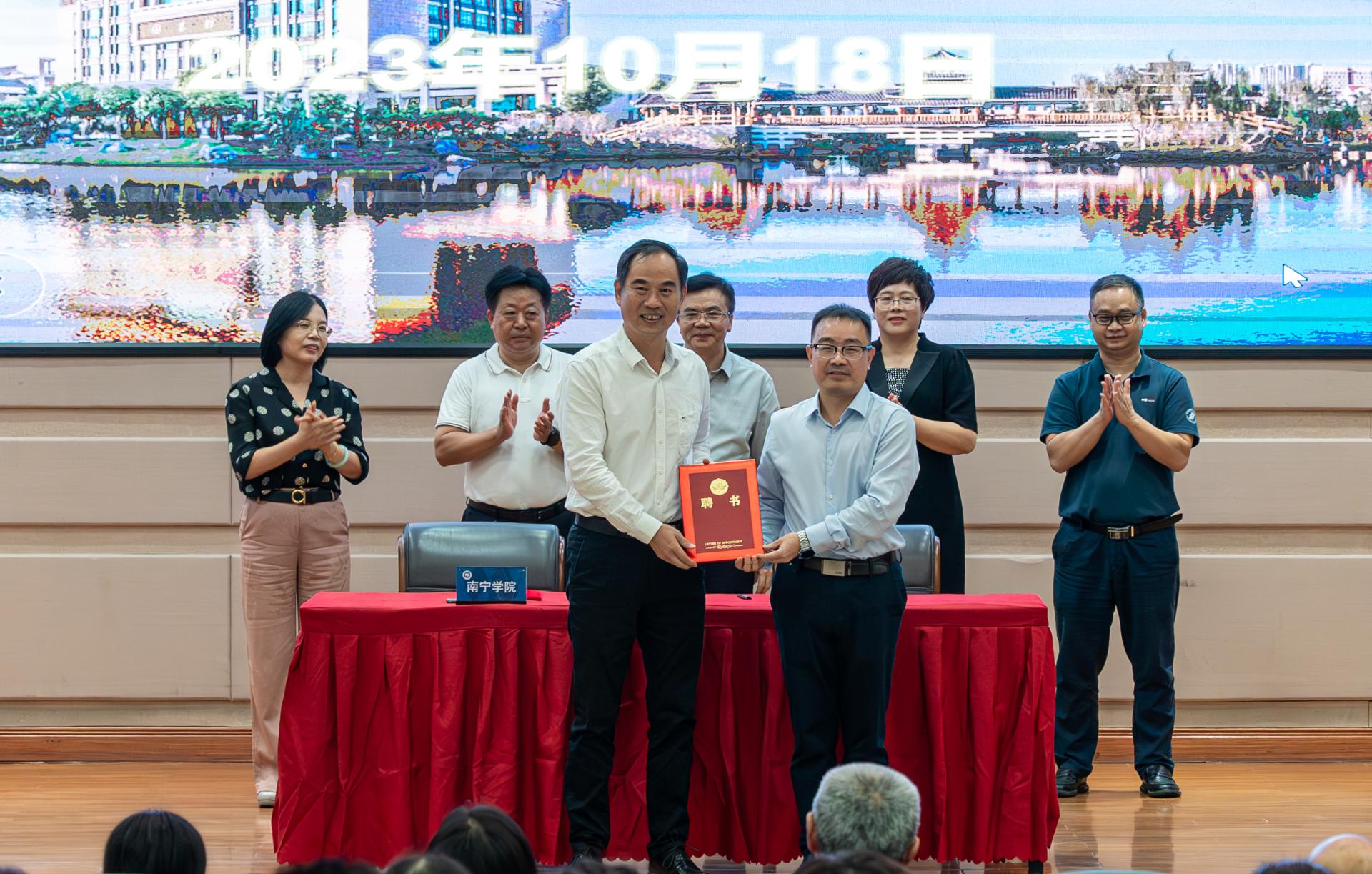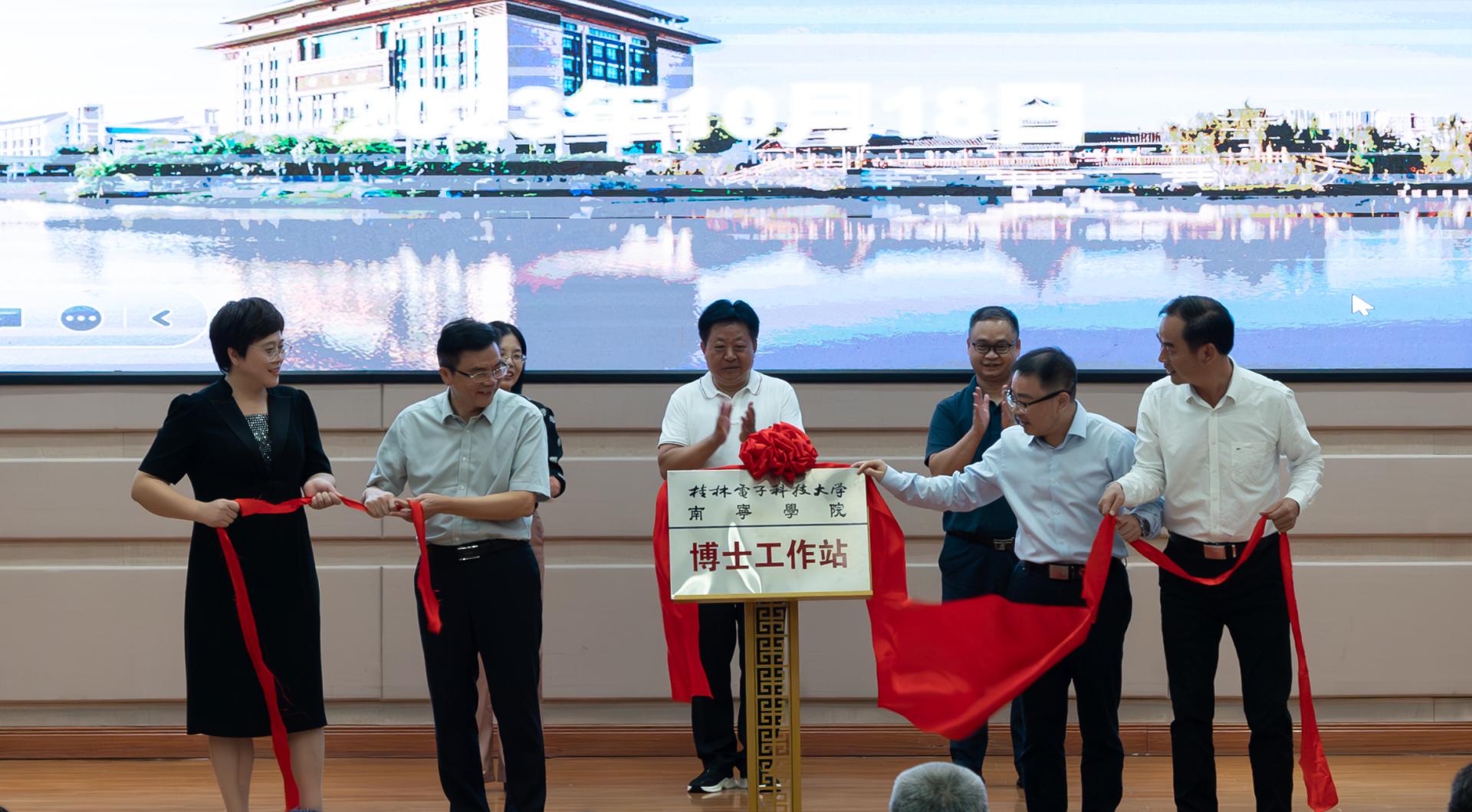 仪式上,桂林电子科技大学徐华蕊校长和南宁学院李栋学校长签订了桂林电子科技大学和南宁学院合作备忘录;李栋学校长为徐华蕊教授、孙希延教授颁发南宁学院客座教授聘书;黄雄彪、张自英、蔡志忠、刘权辉、王标等领导见证合作签约和颁授聘书仪式。随后,黄雄彪、徐华蕊、张自英、李栋学等领导共同为桂林电子科技大学—南宁学院合作签约暨博士工作站揭牌。最后,领导嘉宾实地考察了位于人工智能与软件学院四楼的博士工作站。