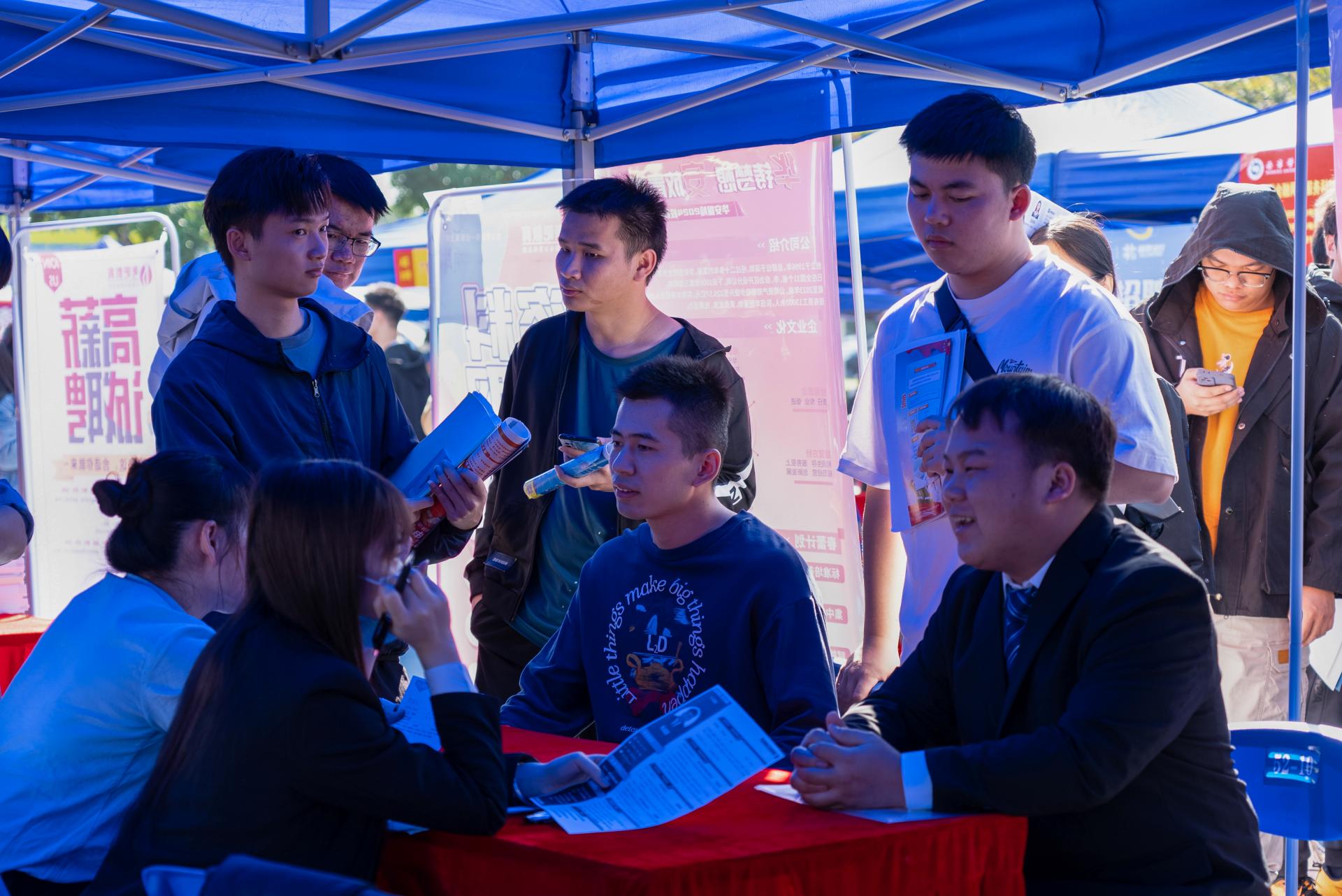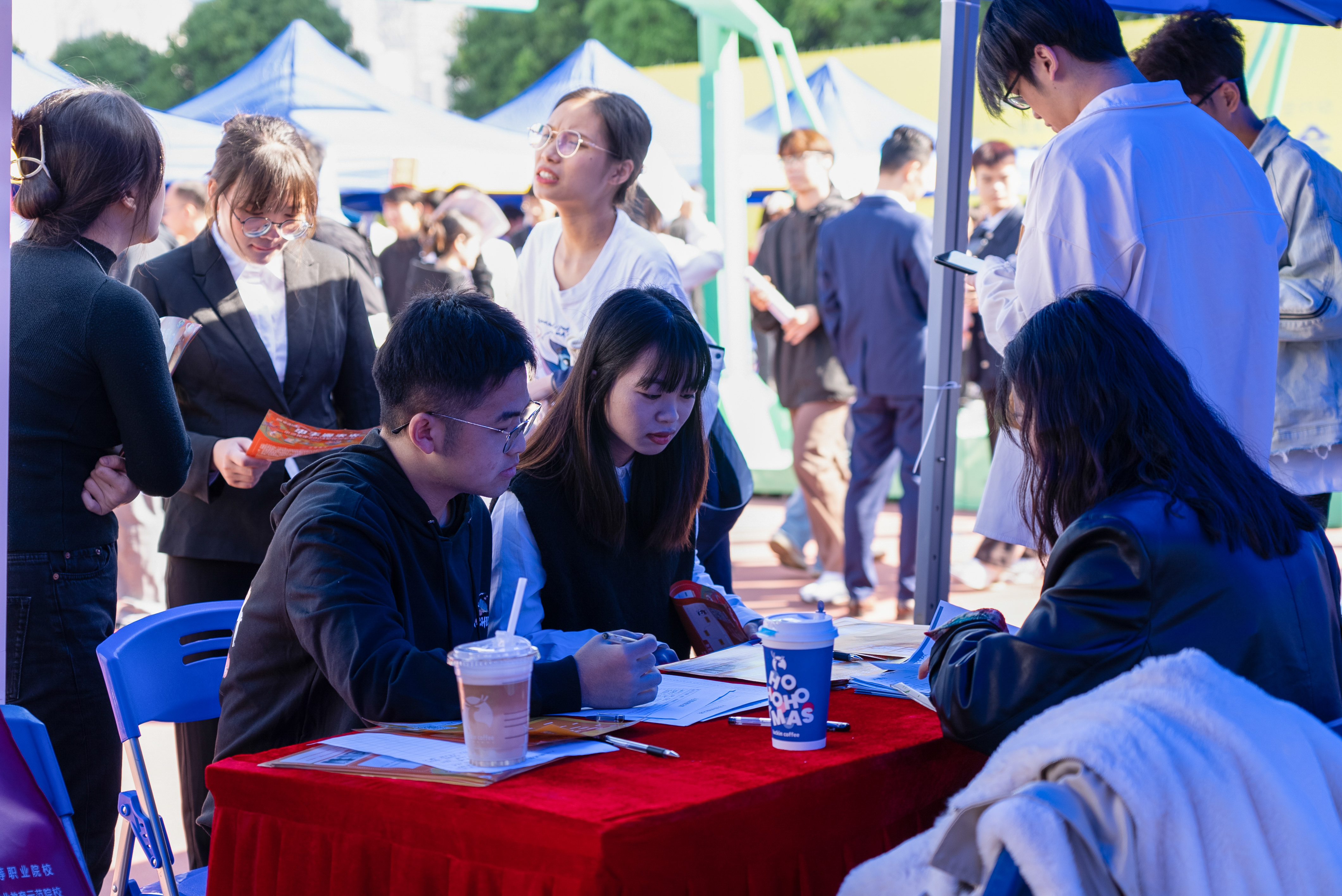 招聘会现场、毕业生们投递简历