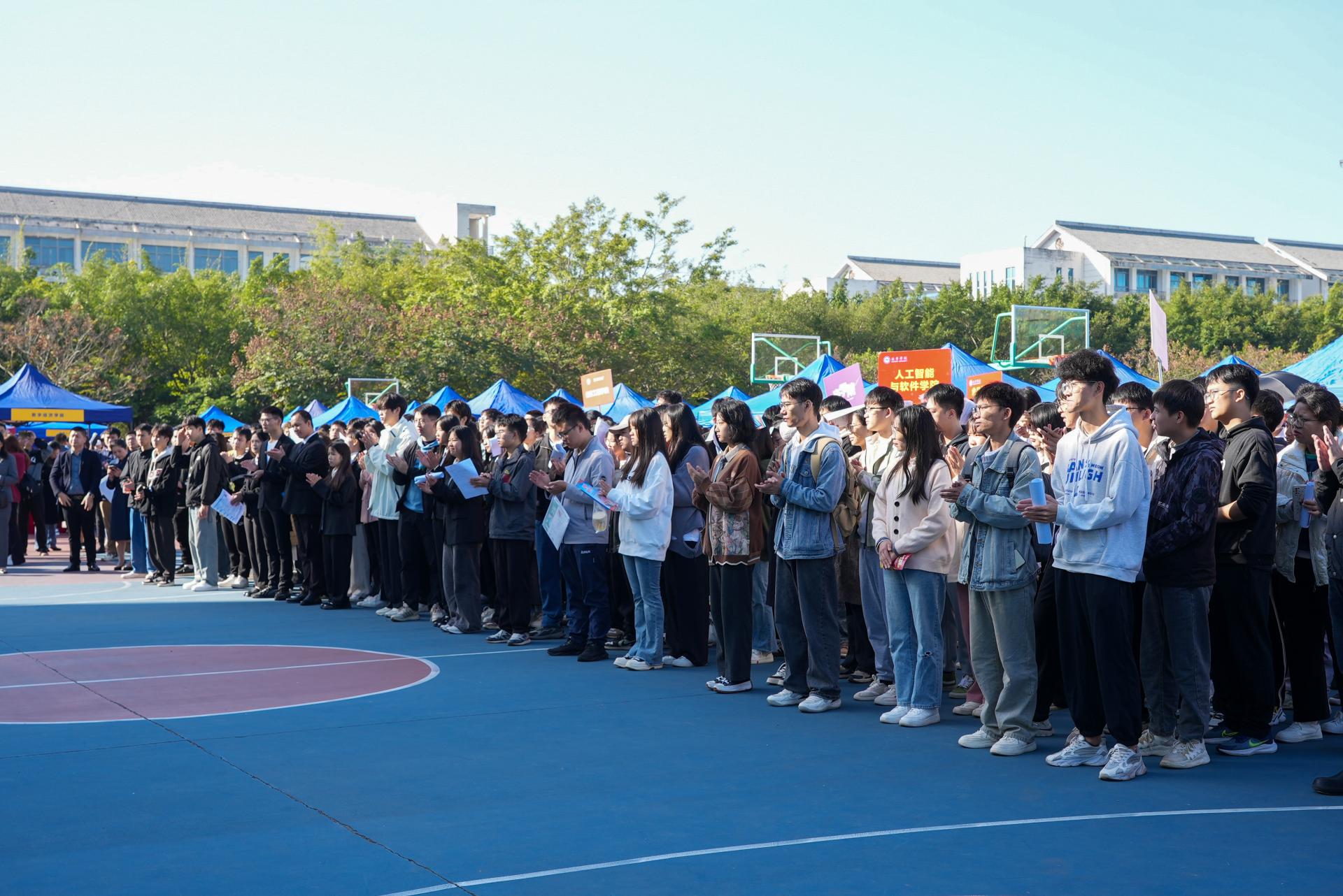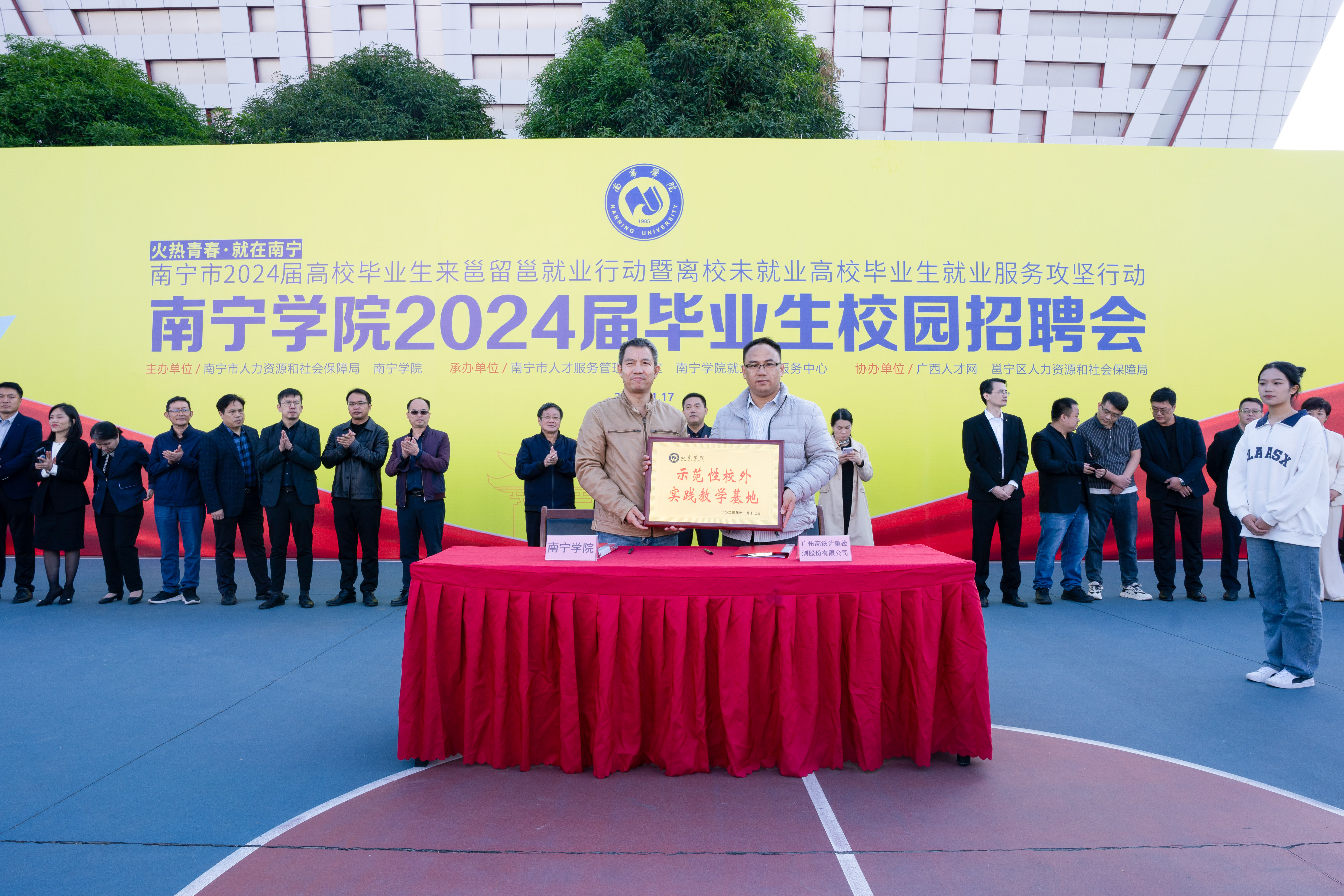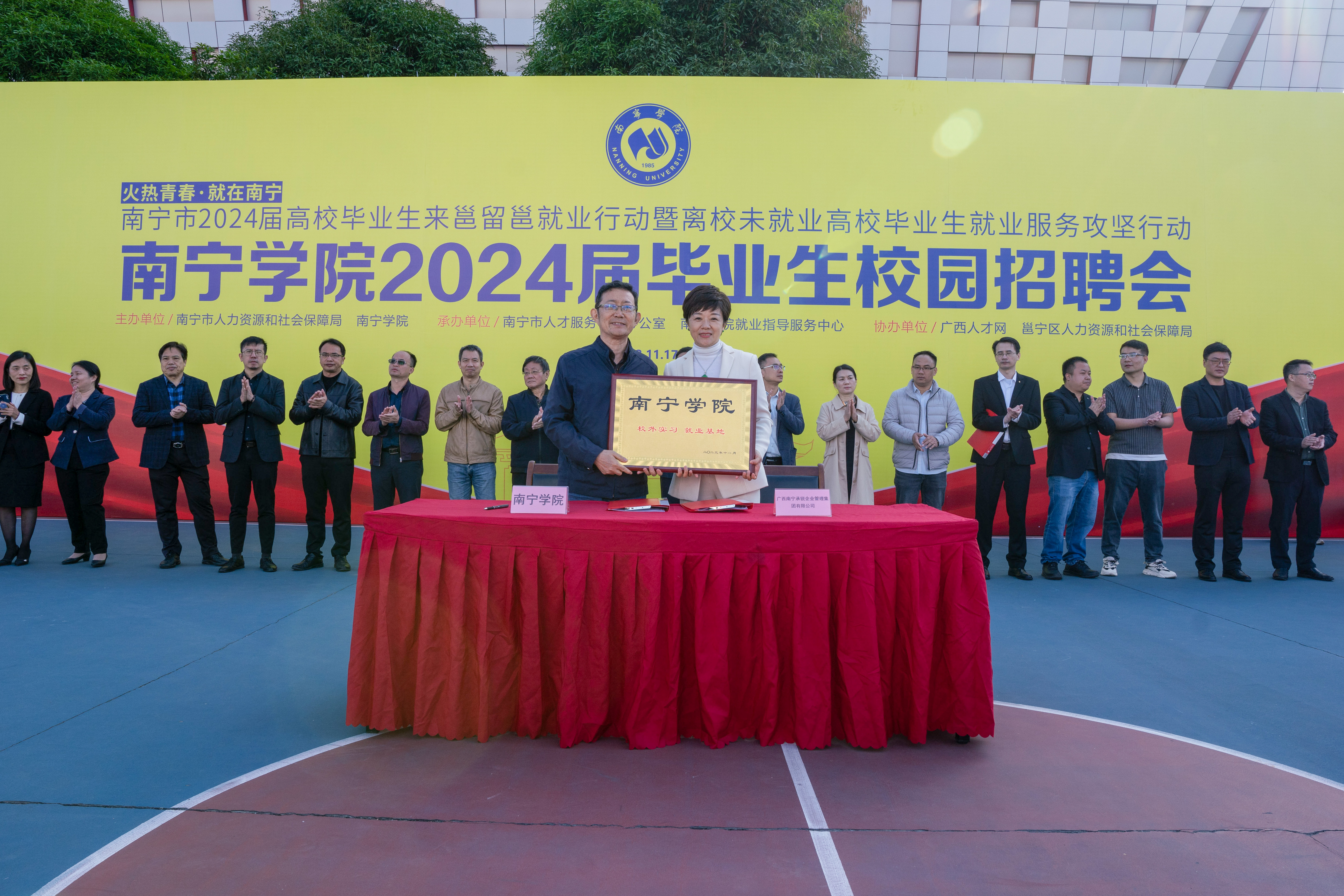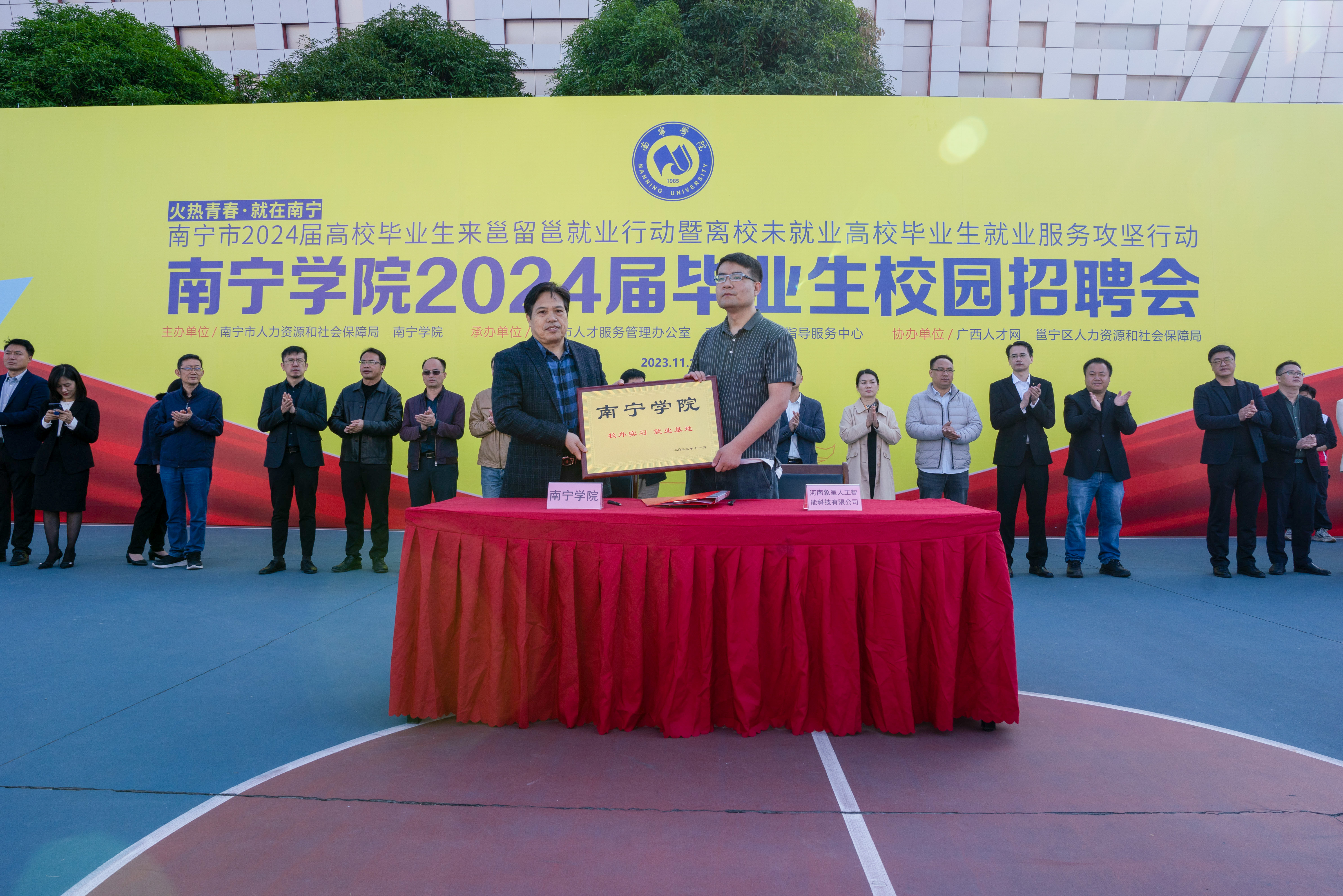 2023年11月17日,为深入学习贯彻党的二十大精神,抓好党中央、国务院及自治区党委、政府关于“稳就业”“保就业”决策部署的贯彻落实精神,在南宁市人力资源和社会保障局的大力支持下,南宁学院在学校篮球场隆重举办“火热青春·就在南宁”南宁市2024届高校毕业生来邕留邕就业行动暨离校未就业高校毕业生就业服务攻坚行动——南宁学院2024届毕业生校园招聘会,为用人单位招揽人才和毕业生优质就业搭建平台。企业代表,南宁市人社局、邕宁区人社局领导,学校领导,各处室、学院领导、老师和毕业班学生代表到场参会。