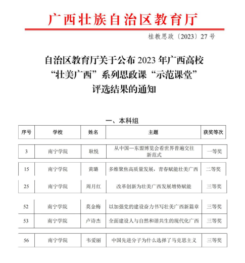 日前,自治区党委教育工委、自治区教育厅下发了《关于公布2023年广西高校“壮美广西”系列思政课“示范课堂”评选活动结果的通知》,我校马克思主义学院耿悦老师主讲的《从中国-东盟博览会看世界普遍交往新范式》荣获本科组一等奖,黄璐老师主讲的《多维聚焦高质量发展,青春赋能壮美广西》荣获本科组二等奖,周月红、莫金梅、卢诗杰、韦爱丽四位老师主讲的《改革创新为壮美广西发展增势赋能》《以加强党的建设奋力书写壮美广西新篇章》《全面建设人与自然和谐共生的现代化广西》《中国先进分子为什么选择了马克思主义》荣获本科组三等奖。“壮美广西”系列思政课“示范课堂”评选活动在今年6月启动,分为网络初评和现场决赛两个阶段、本科组和高职高专组参赛组别。全区参加评选的示范课堂共有201堂,本科组共评选出64堂区级示范课,我校推荐的六位参赛教师六堂示范课实现了全获奖的好成绩,这充分展现了学校思政课教学改革成果及教师教学能力水平。