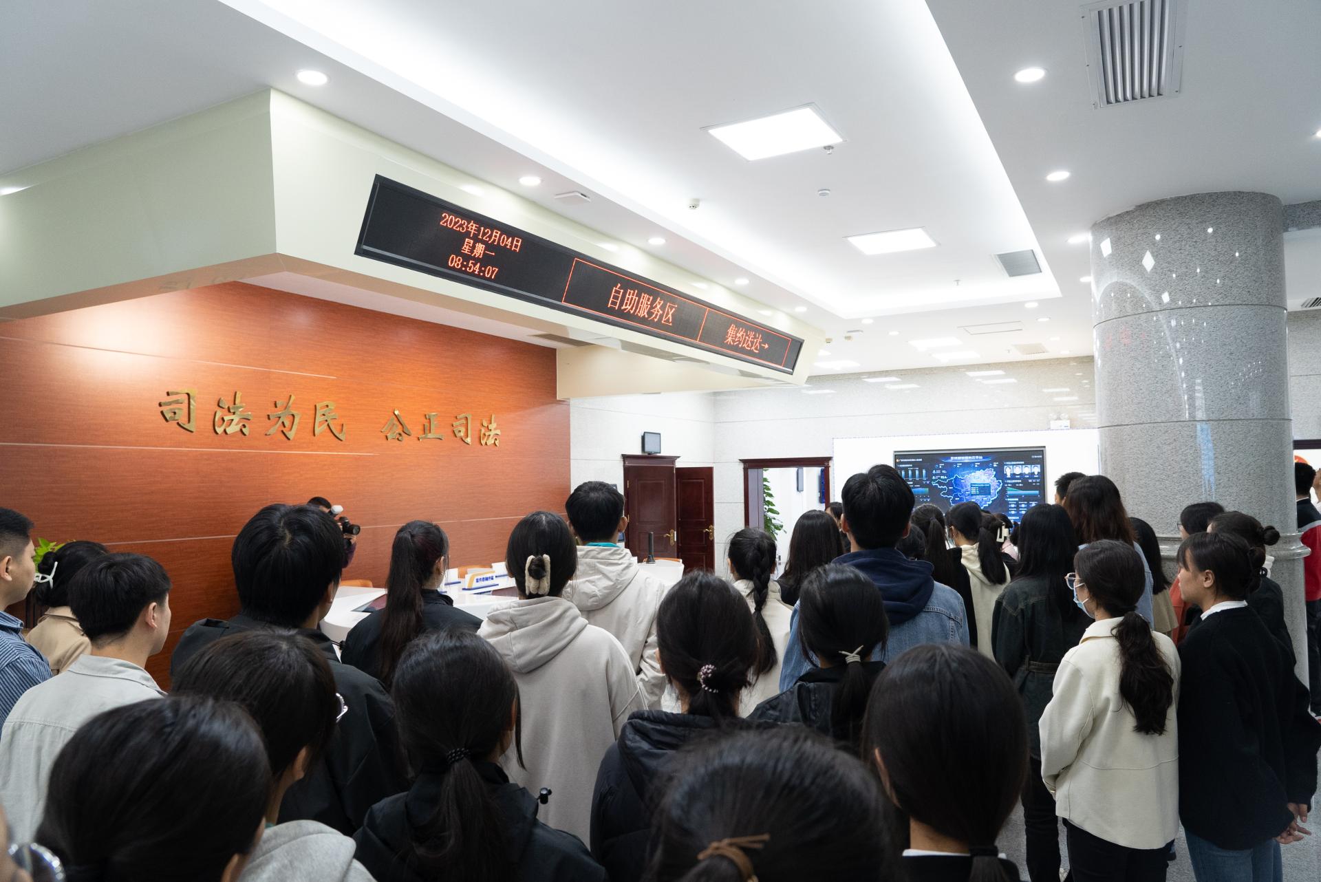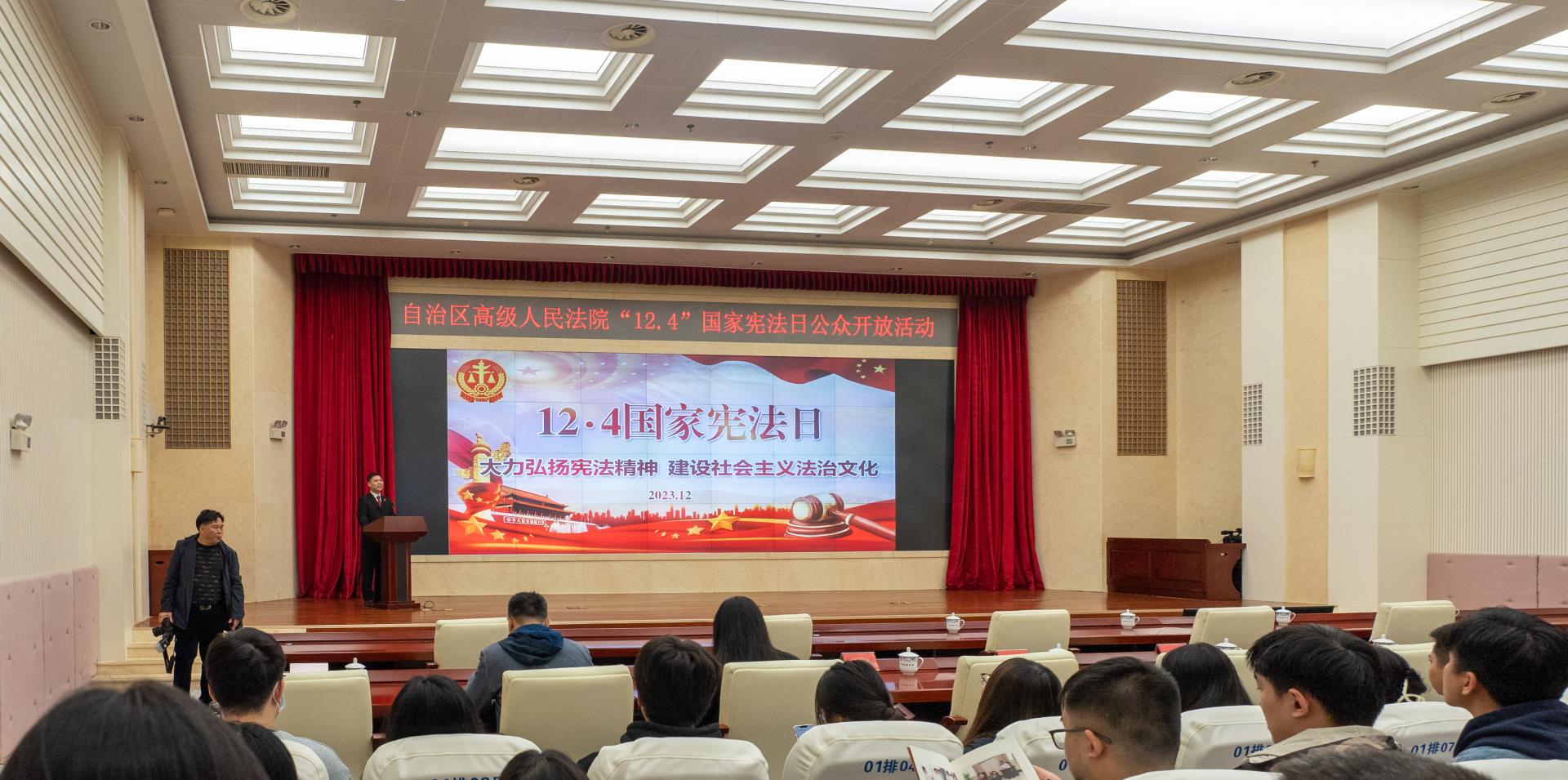 2023年12月4日是我国第十个国家宪法日,自治区高级人民法院开展国家宪法日公众开放活动,举行升旗仪式和宪法宣誓活动,学校21名师生受邀走进法院参观学习,了解法院工作与文化。