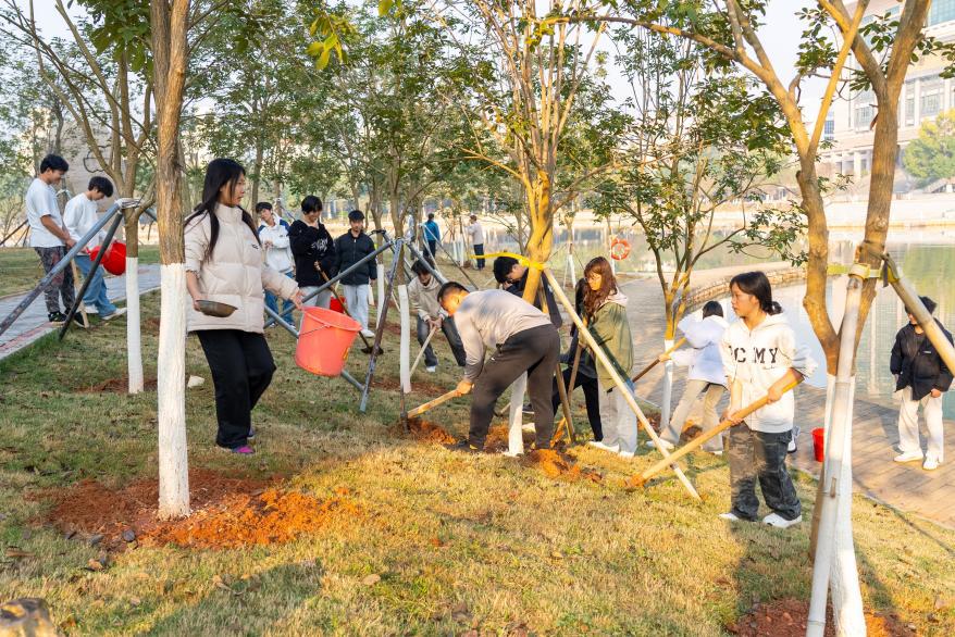 后勤保障与基建管理处的工作人员为同学们做了任务安排,告知本次的劳动内容是为黄花风铃树施肥,以保证来年风铃花的盛开,讲解了挖坑、施肥的注意事项,并做了现场示范。在活动现场,同学们分工明确,充满热情地投入到挖坑施肥工作中。经过一个半小时的劳动,完成了对不孤湖南岸共计120棵黄花风铃树的施肥,同学们不仅学会了绿化施肥的技巧,还体会到了劳动的辛苦和快乐。
