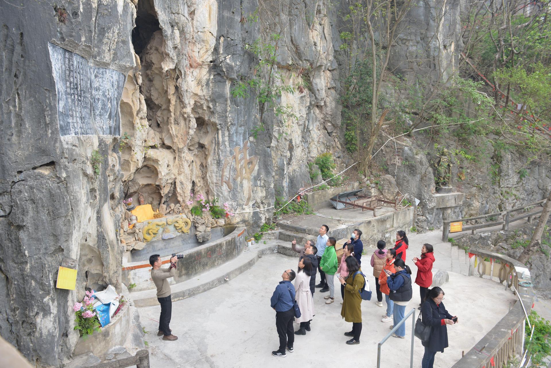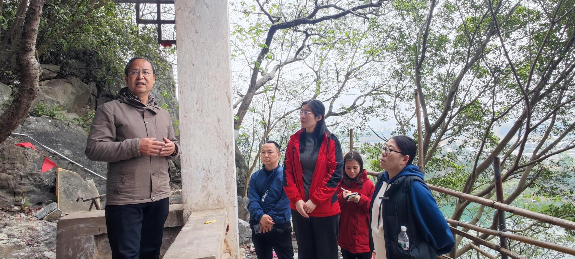 课程组最后一站来到扶绥县城西笔架山腰的明代遗址金鸡岩。金鸡岩乃明代著名的地理学家、旅行家徐霞客三进三出之地。课程组在金鸡岩感受大自然的鬼斧神工,品味历史的深厚底蕴。金鸡岩的崖壁上题写了第八届全国人大副委员长甘苦与夫人黄娟、诗人张报与夫人惠心一块题写的一首诗:“山是故乡明,水是故乡甜,人是故乡亲,月是故乡圆”。陈教授现场为课程组讲授了广西伏波崇拜的缘由主要有:历史上伏波将军对两广地区的平安稳定作出了重要贡献,造福了人民,受到当政者的嘉奖,并被后世皇帝多次敕封;伏波将军在平叛战乱的同时把中原文明传到了岭南地区,实现民族融合团结;伏波将军出征的目的是为了维护国家领土的完整和主权的统一。