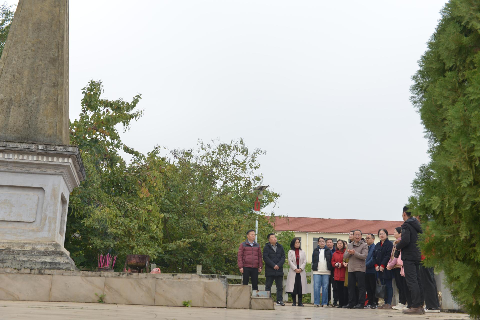 课程组第一站来到了扶绥县山圩镇山圩村,考察位于G322国道旁的陆军第一百八十八师抗战阵亡将士纪念塔。在烈士纪念塔前,课程组为牺牲的烈士们上香敬酒、鞠躬凭吊,陈雄章教授现场为大家详细介绍了桂南会战、山圩阻击战及扶绥县境三次抗击日寇战斗经过,1939年11月,日本侵略军由钦州登陆,沿邕钦公路转入邕龙公路,进攻龙州,沿途烧杀掳掠。当日寇窜至山圩附近的守界村时,被国民党一八八师以不足7个营的兵力包围伏击,两军鏖战两昼夜,双方伤亡颇大,血流成渠,横尸遍野。为纪念抗日阵亡将士,1941年4月15日,当地在山圩建立这座纪念塔,一八八师师长魏镇撰写的碑文来纪念这段历史“墓塔既成,爱志其崖略而为之歌曰:桂岭苍苍,左江泱泱;烈士之风,山高水长;巍峨墓塔,万古流芳。”八十多年过去了,魏镇师长所题祭文至今犹存。