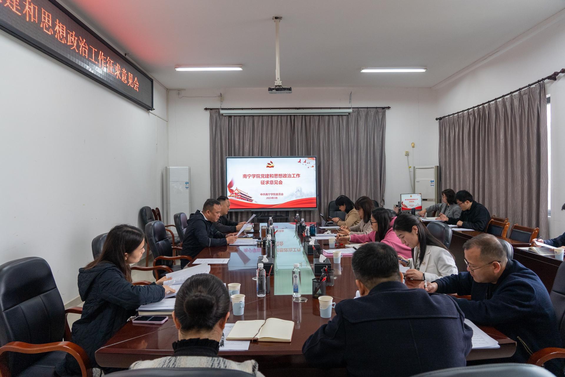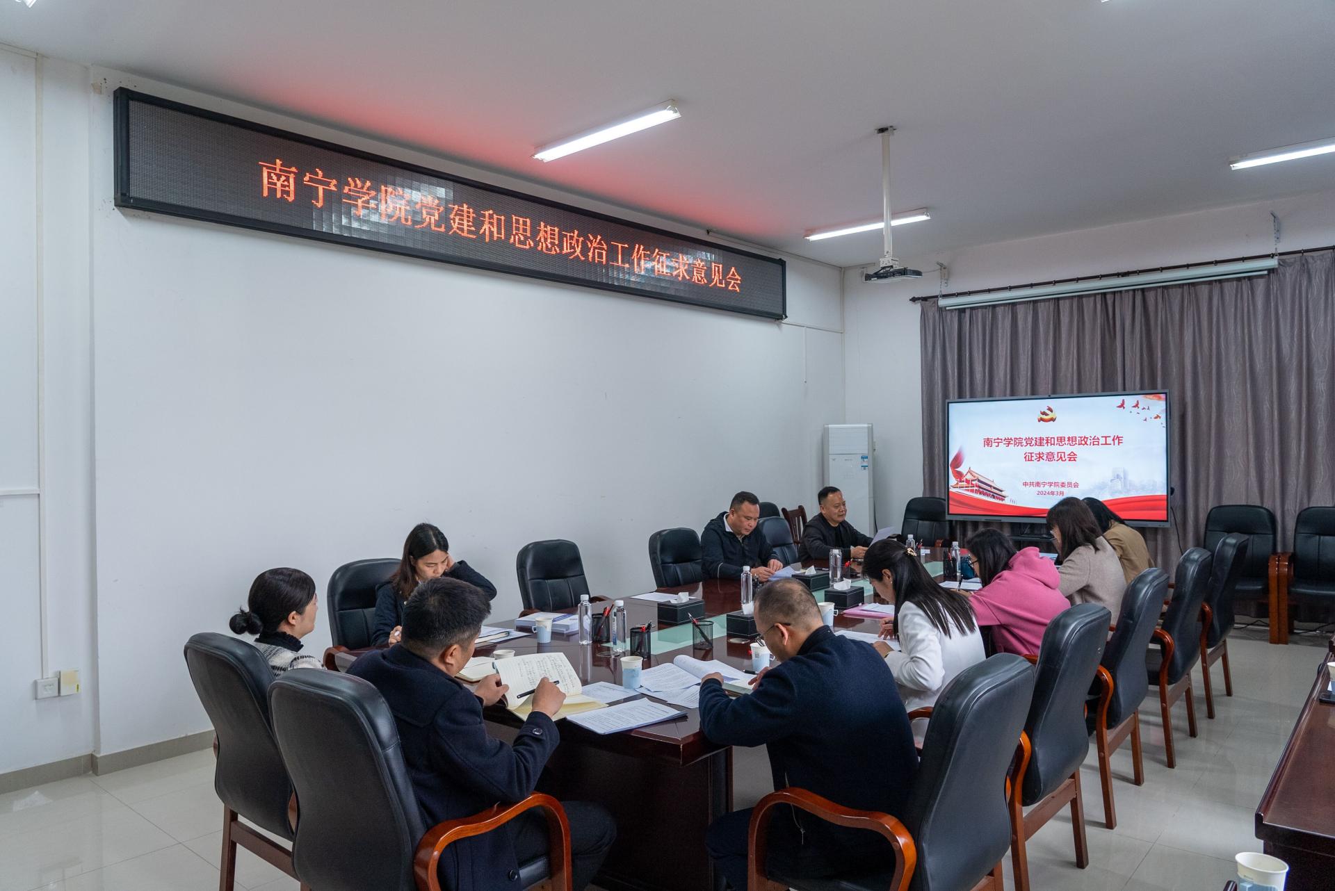 会议围绕学校党委即将出台的《中国共产党南宁学院委员会2024年工作要点》《南宁学院管理人员深入基层联系学生工作制度》、南宁学院2023年校园十大新闻、党建及思想政治理论与实践研究培育相关项目四项工作征求意见建议。