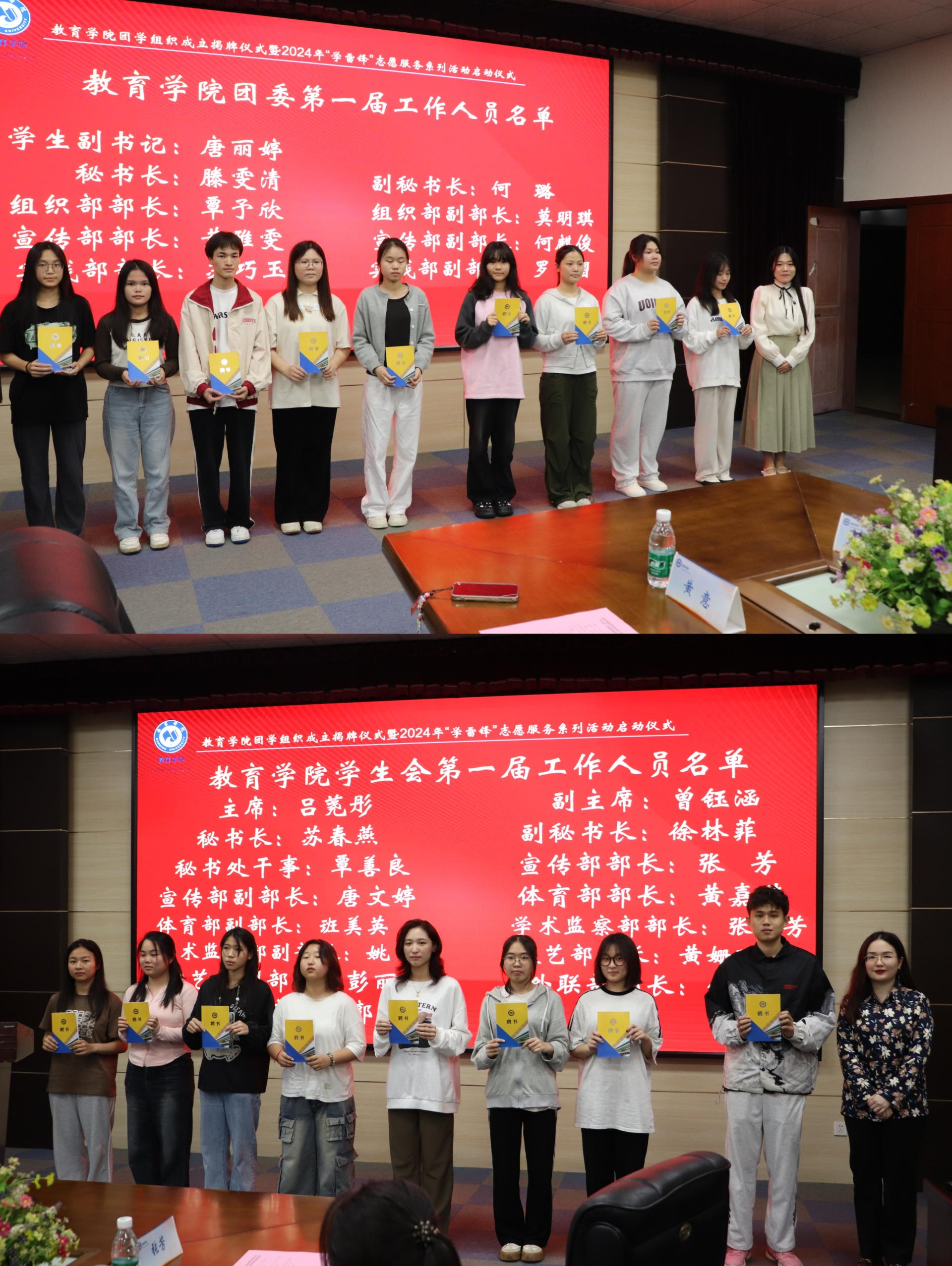 紧接着,辅导员黄钰善老师宣读《关于成立教育学院学生会的通知》(院团字【2024】3号)《关于公布教育学院学生会第一届工作人员任职决定的通知》(院团字【2024】8号),宣布教育学院学生会正式成立,并任命吕荛彤等15名学生为教育学院学生会第一届工作人员,邱雅玥老师为他们颁发聘书。黄瓅书记、顾晨光副院长为学生会成立揭牌。学生会主席吕荛彤作代表发言。