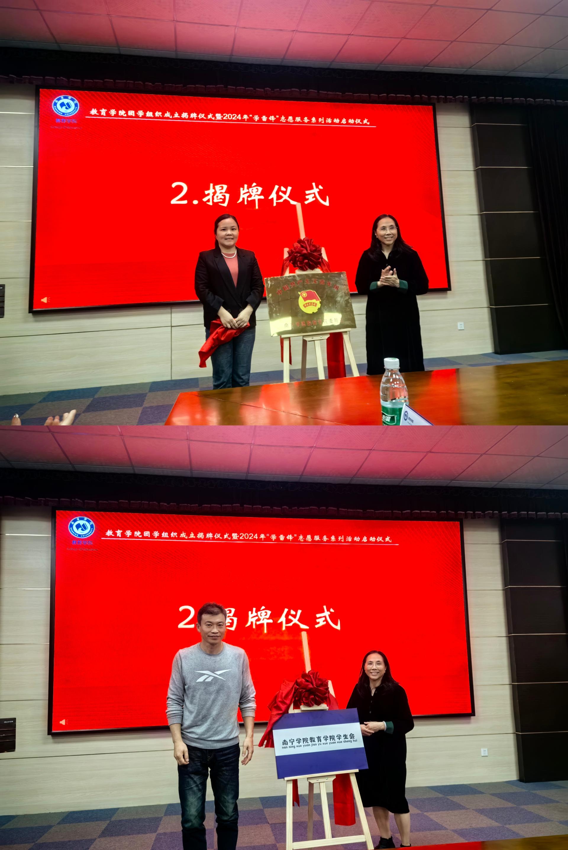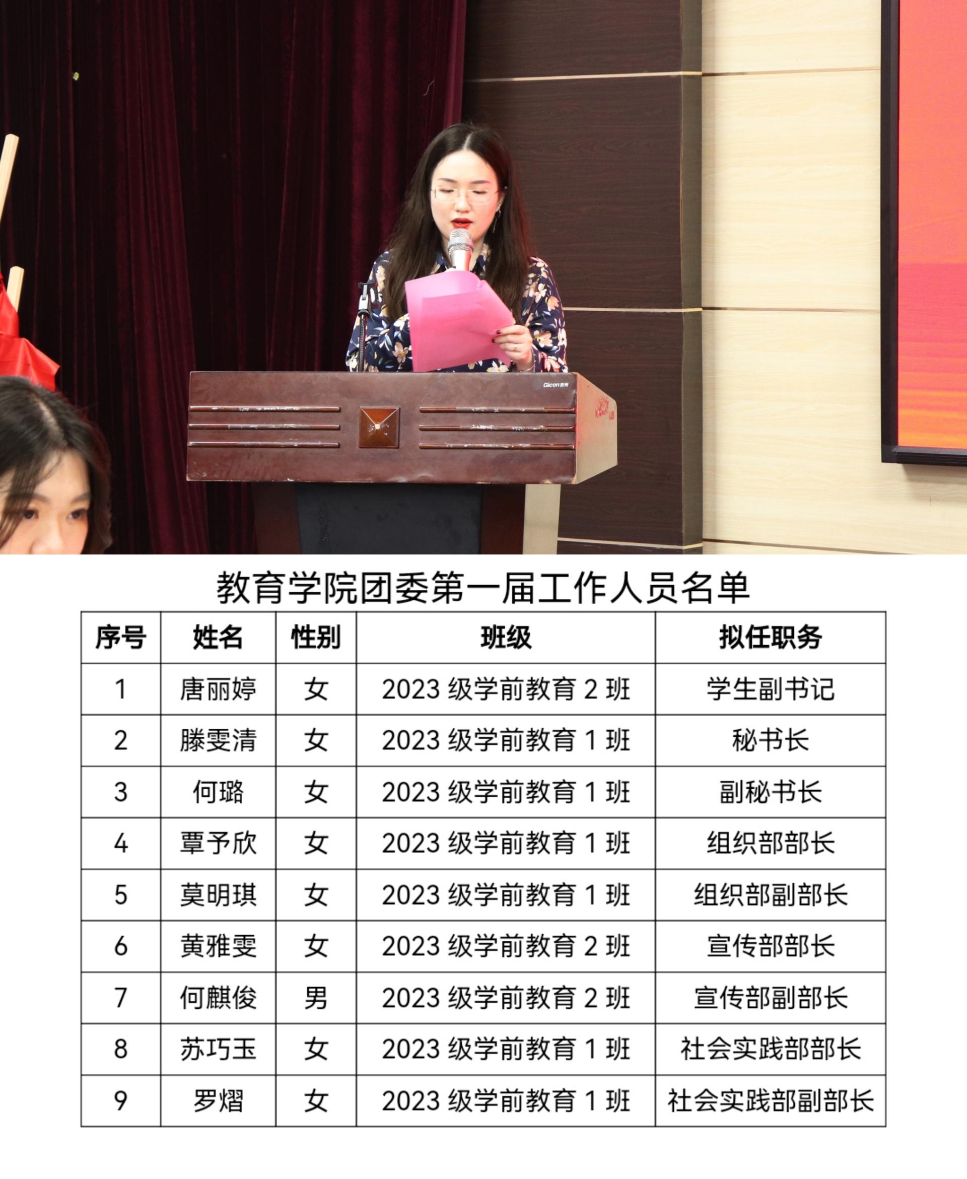 大会在校歌《锦绣前程·充满阳光》的歌声中拉开帷幕,班主任邱雅玥老师宣读《关于成立教育学院团委的通知》(校团字【2024】1号)《关于公布教育学院团委第一届工作人员任职决定的通知》(院团字【2024】7号),宣布共青团南宁学院教育学院委员会正式成立,并任命唐丽婷等9名学生为教育学院团委第一届工作人员,黄意老师为他们颁发聘书。黄瓅书记、黄玉副院长为团委成立揭牌。学生副书记唐丽婷作代表发言。