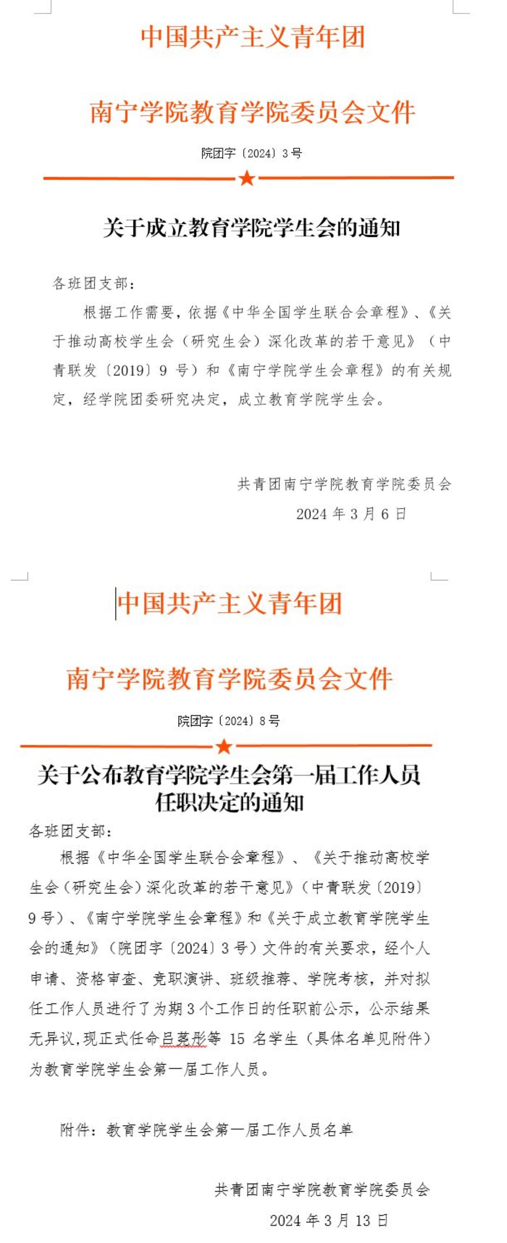 成立教育学院学生会及工作人员任职决定通知文件