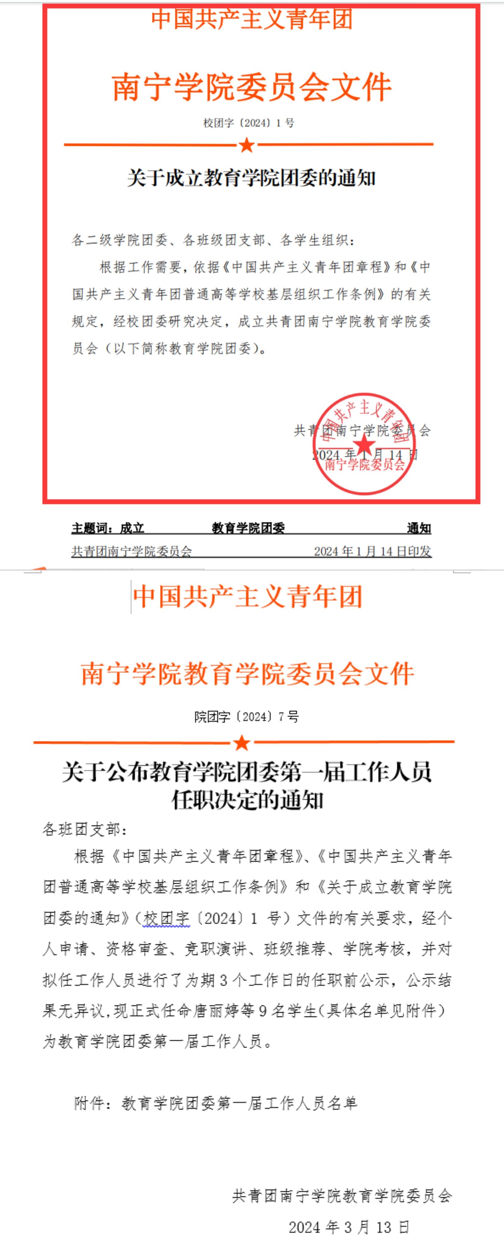 成立教育学院团委及工作人员任职决定通知文件