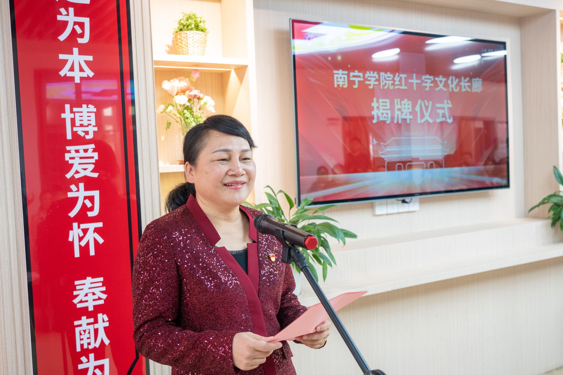 仪式上,南宁市红十字会党组书记黄海燕致词,黄海燕书记提出,2021年11月,在南宁市红十字会的指导和南宁学院的支持下,成立了南宁学院红十字会,之后在校内开展了应急救护培训、无偿献血和捐献造血干细胞等一系列富有成效的活动,受到师生们的欢迎。希望通过这个文化长廊,把学校精神文明创建、德育工作、素质教育、生命教育等与红十字文化宣传有机结合,为广大师生打造一个集“红十字文化宣传、应急救护知识普及和休闲阅读体验”为一体的开放式公共学习空间。