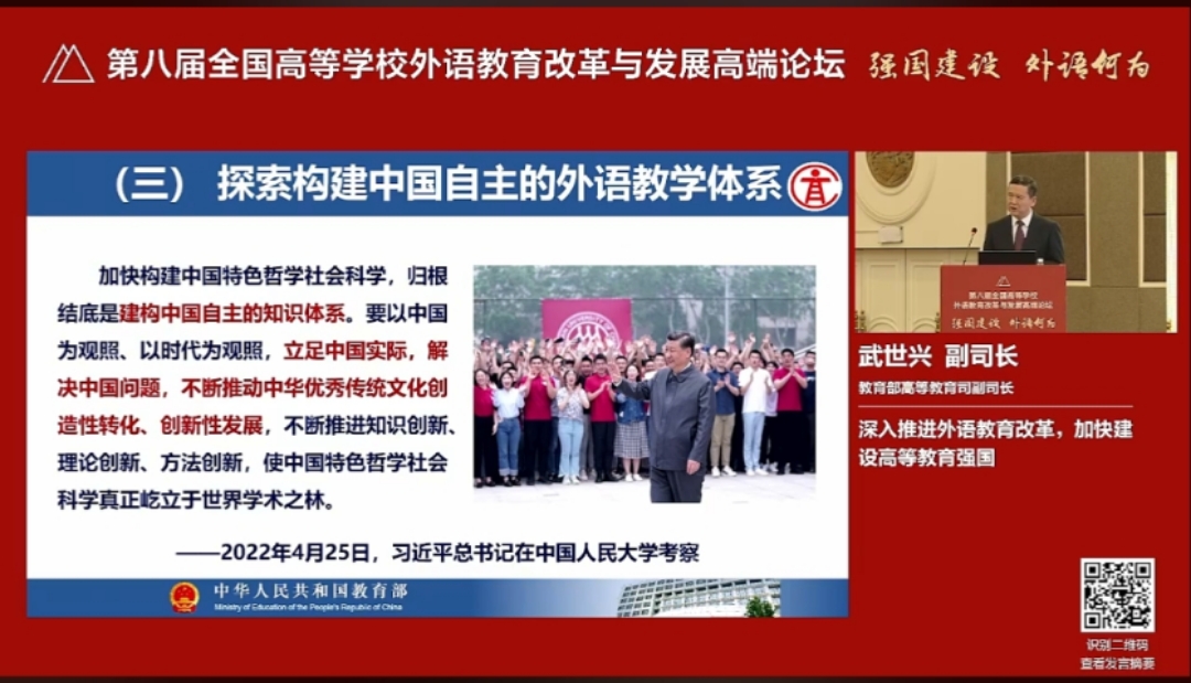 教育部高等教育司副司长武世兴作“深入推进外语教育改革 加快建设高等教育强国”主旨报告